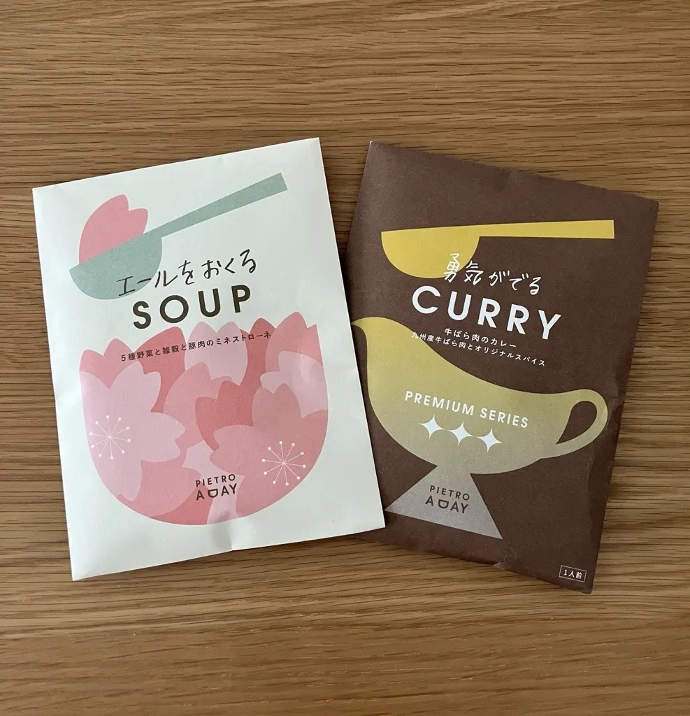 今回レポートするのは、「贈った人も もらった人も あたたかい。」がテーマのブランド「PIETRO A DAY」の『「エールをおくるSOUP」5種野菜と雑穀と豚肉のミネストローネ(限定パッケージ)』と『 「勇気がでるCURRY」牛ばら肉のカレー 九州産牛ばら肉とオリジナルスパイス』の2品です!