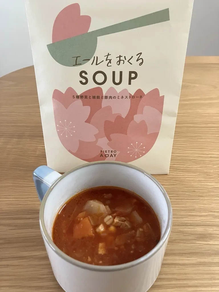 通常は「元気をつくるSOUP」として販売していますが、2026年1月~4月の期間は限定パッケージ「エールをおくるSOUP」としても販売しています!「サクラサク」新生活の門出のイメージから、桜デザインになっています!かわいいですよね~🌸
