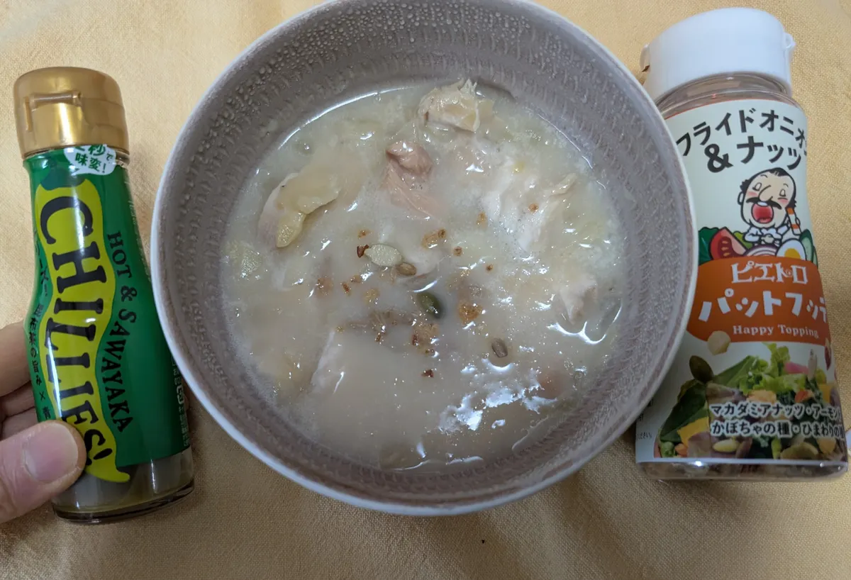 トップ > 写真館 > 今日のしあわせごはん > 福来たる💕 ポクテ 2026/01/17 16:40 福来たる💕 昼ご飯に福来たるの鶏白湯スープ頂きました✨✨ 温めてパッケージ開けた瞬間から白湯の良い香り💕💕💕 鶏肉が好きなので追加で鶏肉入れて頂きます🙏 夜勤明けの身体に染みる優しい味と鶏油の旨味🤤 先ずはそのままで、そのあといろいろしたくなりパットフッテとチリーズ青をかけて😁 チリーズ青がまたまた合う✨✨ 写真撮った後、チリーズ青かけまくり薬味に葱を入れて完食😋 かんしょ いいね 共有する 共有する X facebook LINE リンクをコピー コメントする 7 件の返信 (新着順) ミュートしたユーザーの投稿です。 投稿を表示 ちゃ 2026/01/26 06:42 ホッと癒されそうです いいね 返信する ミュートしたユーザーの投稿です。 投稿を表示 ポクテ 2026/01/26 13:26 ちゃ ありがとうございます✨ いいね 返信する ミュートしたユーザーの投稿です。 投稿を表示 ウルトラの母 2026/01/21 18:58 夜勤明けの身体に染みる優しい味と鶏油の旨味 がまさにのスープですよね。 いいね 返信する ミュートしたユーザーの投稿です。 投稿を表示 ポクテ 2026/01/22 18:36 ウルトラの母 ほんまにまさに!のスープでした✨ いいね 返信する ミュートしたユーザーの投稿です。 投稿を表示 あきたん 2026/01/19 23:38 鶏白湯スープにCHILLIES!青唐辛子😲✨️ CHILLIES!にヤミツキな私も 試してみたくなりました🥹⟡.· いいね 返信する ミュートしたユーザーの投稿です。 投稿を表示 ポクテ 2026/01/20 23:17 あきたん ぜひぜひ〜✨✨ スープが一段と味がしまって美味ですよ😚💕 いいね 返信する ミュートしたユーザーの投稿です。 投稿を表示 tan 2026/01/19 22:00 私も、これ食べました スープというより、具😋 贅沢ですよね いいね 返信する ミュートしたユーザーの投稿です。 投稿を表示 ポクテ 2026/01/20 23:16 tan ほんまに贅沢なスープですよね✨✨✨ 冬にはありがたい🥰 いいね 返信する ミュートしたユーザーの投稿です。 投稿を表示 トクちゃん 2026/01/19 14:26 体に良いですね。 いいね 返信する ミュートしたユーザーの投稿です。 投稿を表示 ポクテ 2026/01/19 18:32 トクちゃん ほんまですね✨ いいね 返信する ミュートしたユーザーの投稿です。 投稿を表示 クワガタ 2026/01/19 11:15 プチプチもち麦が、入ってて美味しですよね(๑˘ ³˘๑)💚刻みネギやってみたいです いいね 返信する ミュートしたユーザーの投稿です。 投稿を表示 ポクテ 2026/01/19 18:31 クワガタ 刻み葱いれてチリーズ青でかなりパワーアップ✨✨ いいね 返信する ミュートしたユーザーの投稿です。 投稿を表示 あくあ 2026/01/17 21:58 疲れた身体に染みわたるスープ、いいですね😆❤️ いいね 返信する ミュートしたユーザーの投稿です。 投稿を表示 ポクテ 2026/01/17 22:39 あくあ とてもシミシミです😚 いいね 返信する