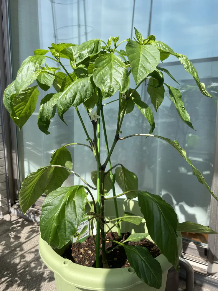ピーマンを育てるのは初めてなのですが、ピーマンの花は茎と茎の間の新芽が出そうなところからぴょこっと一輪咲くんですね😲