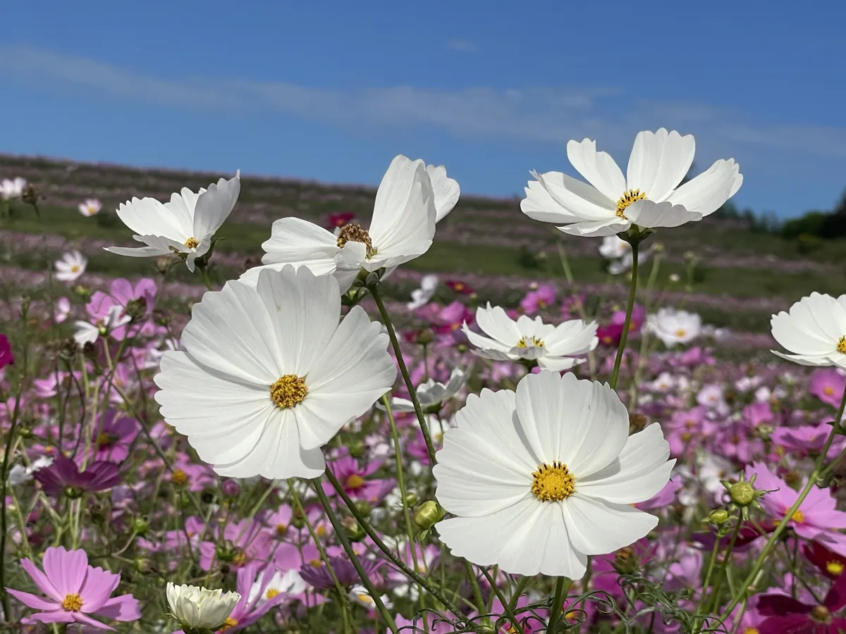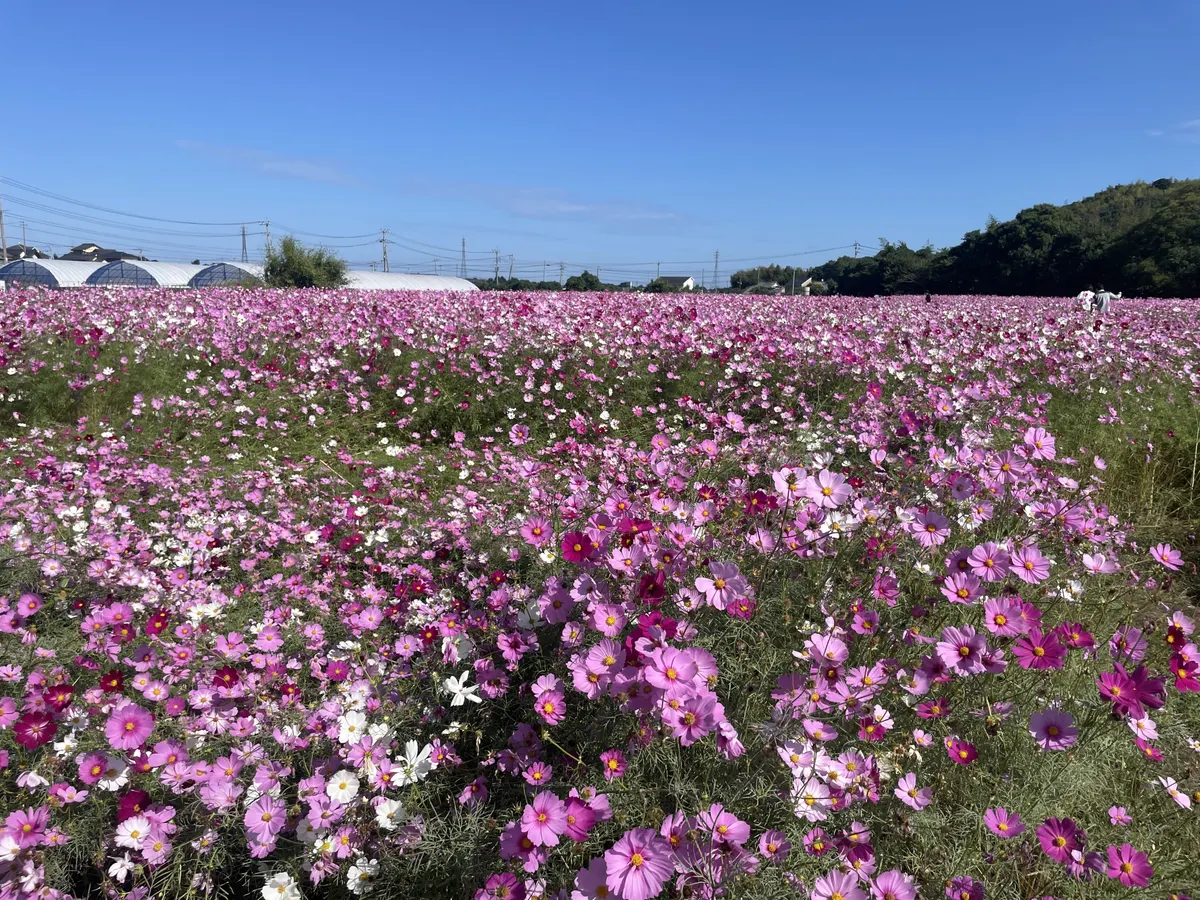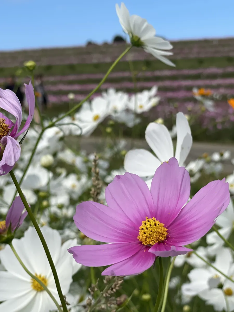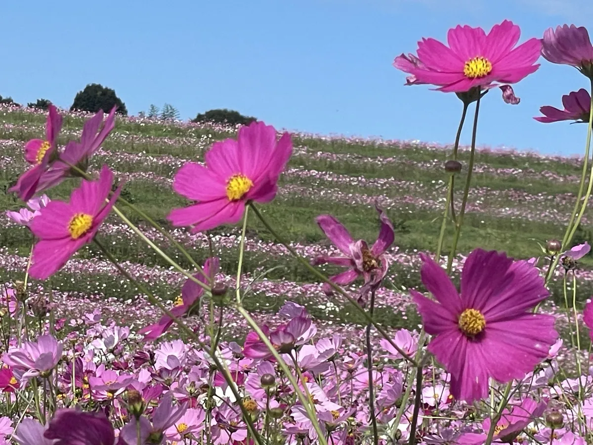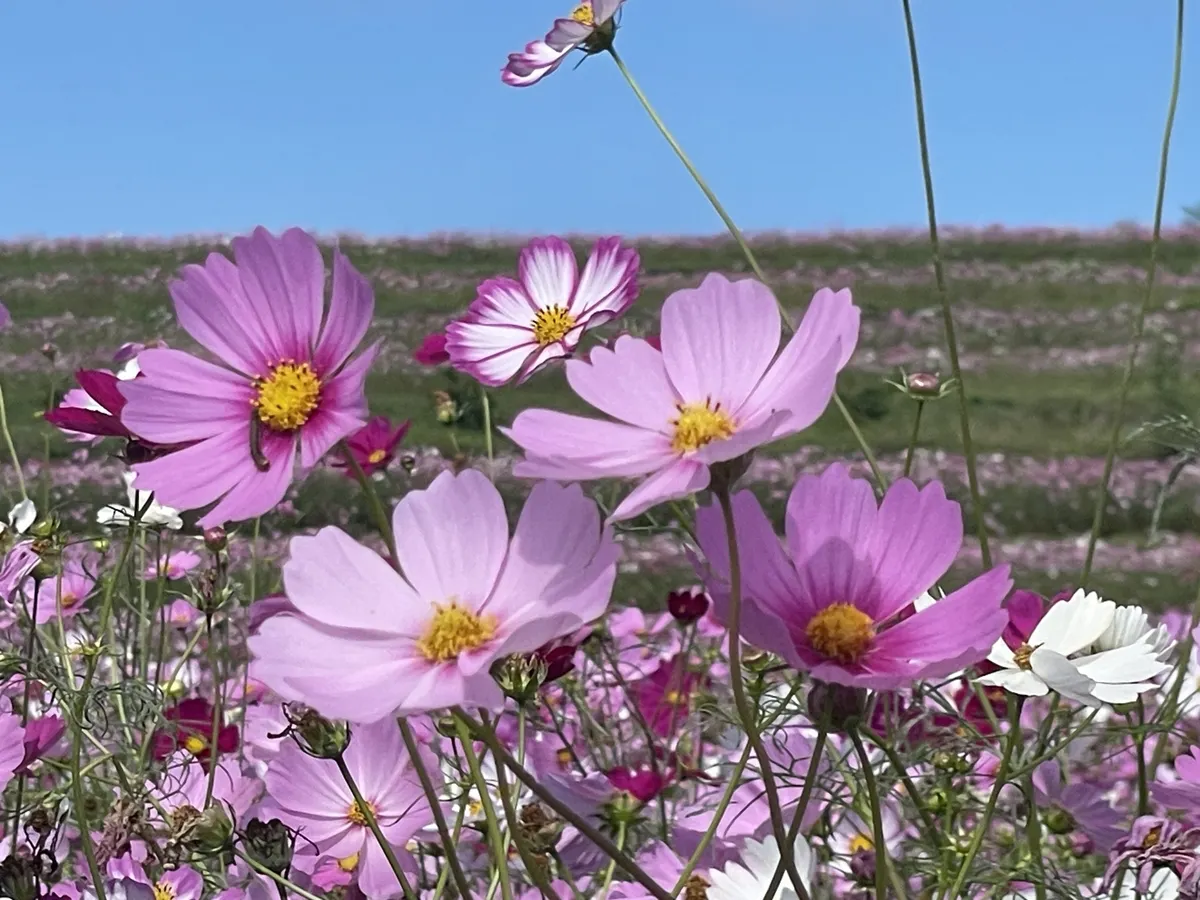 投稿を表示秋晴れにたくさんのコスモスが映えて、素敵ですね。ヒマワリ観賞も楽しめて、いいですね。