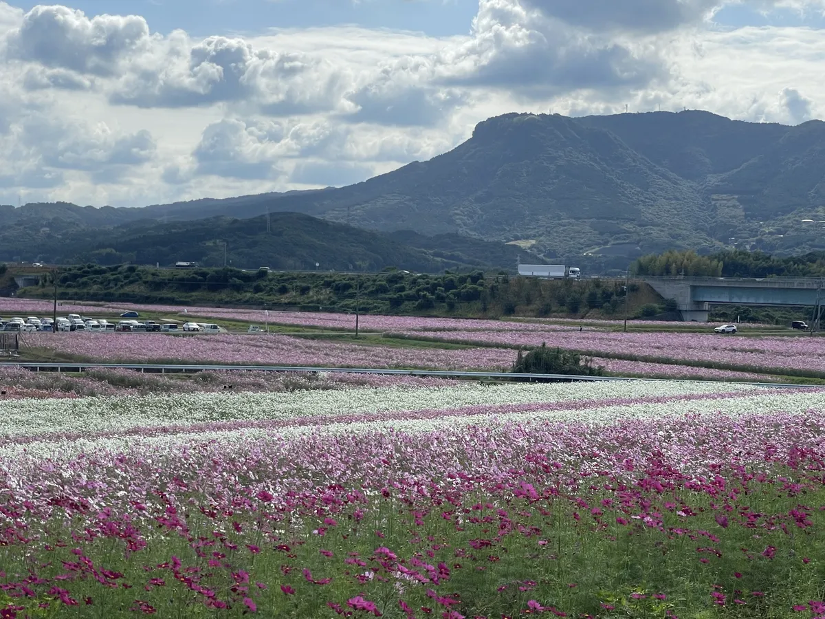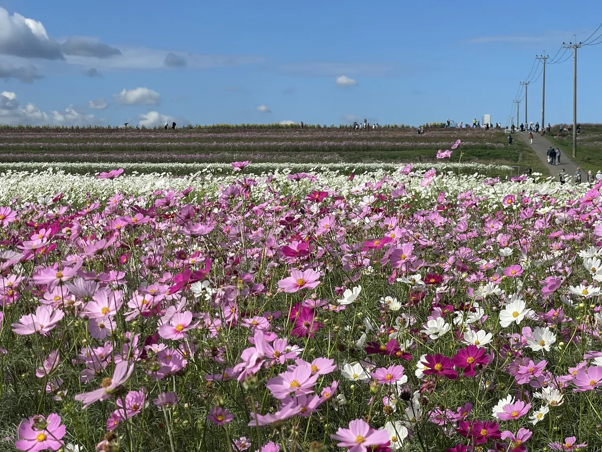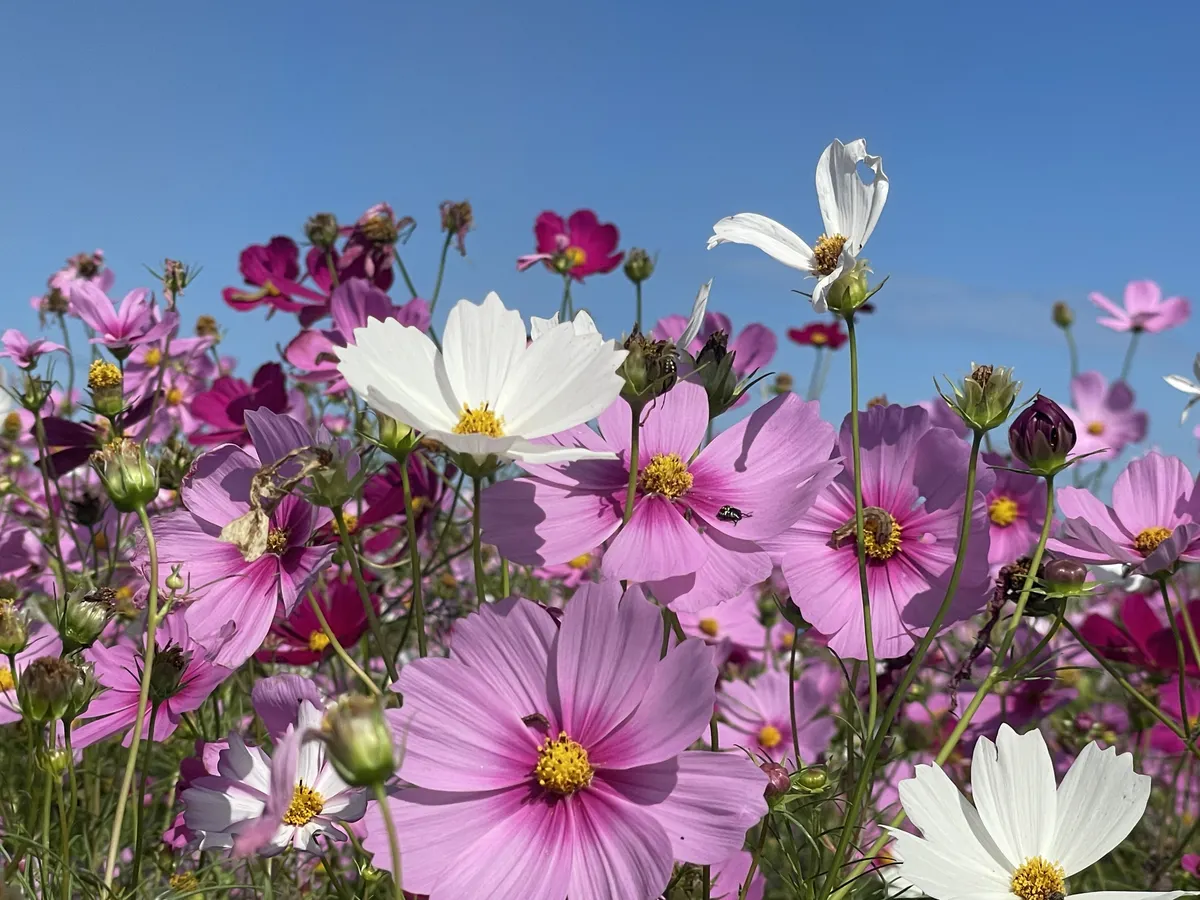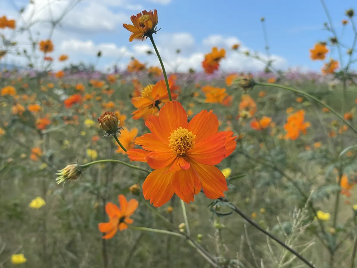 投稿を表示秋晴れにたくさんのコスモスが映えて、素敵ですね。ヒマワリ観賞も楽しめて、いいですね。