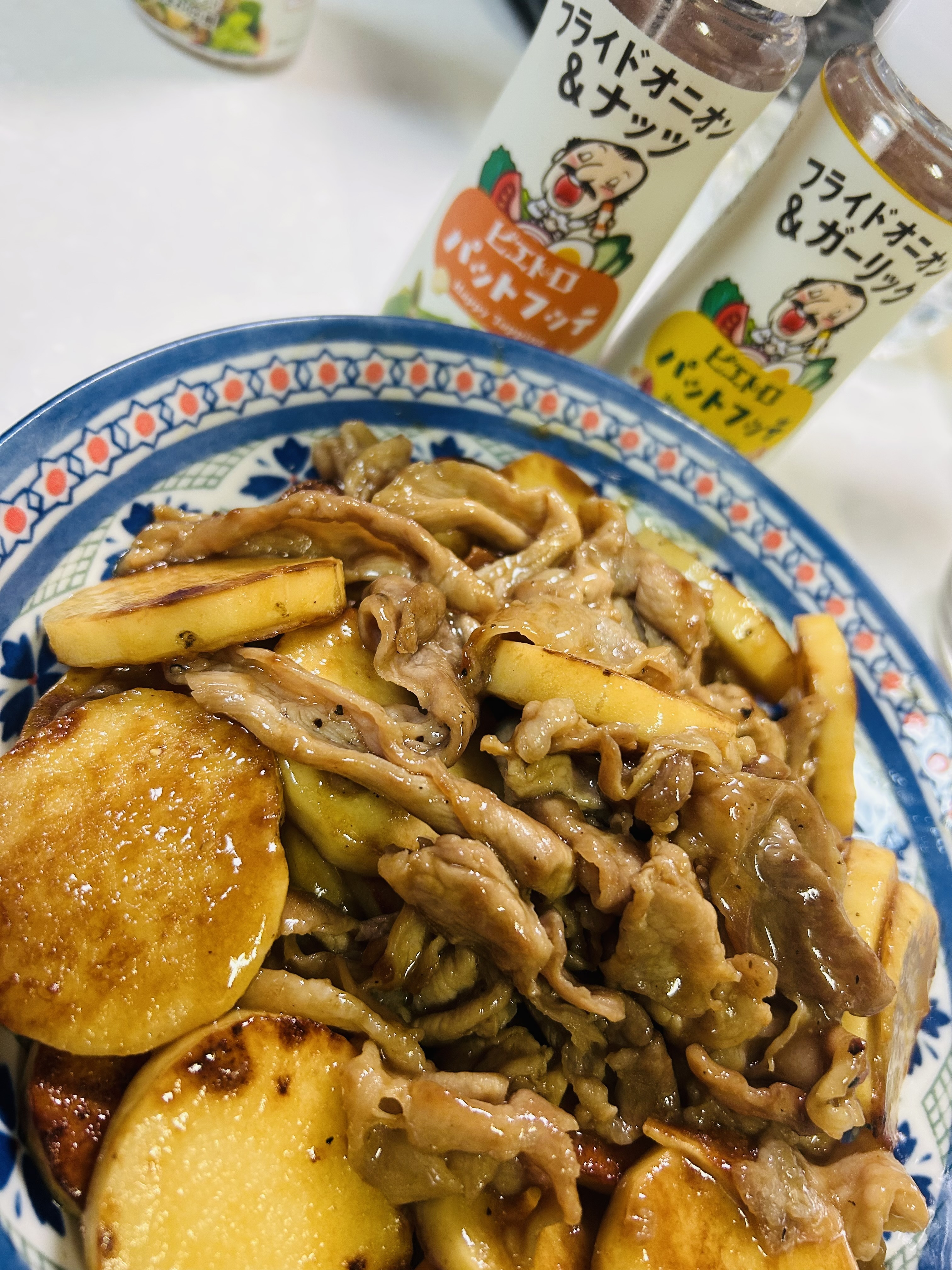 豚肉と山芋で甘辛く炒めました‪(⸝⸝› з ‹⸝⸝)‬♡えいとさんにも食べてほしいなぁ〜