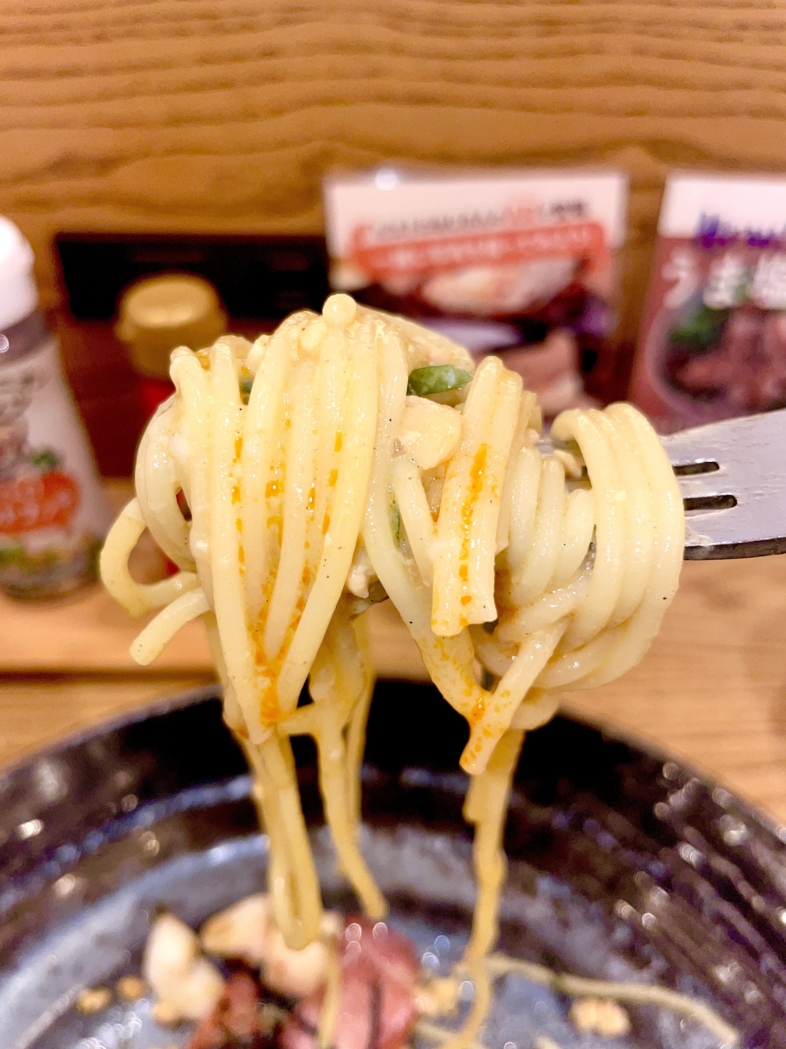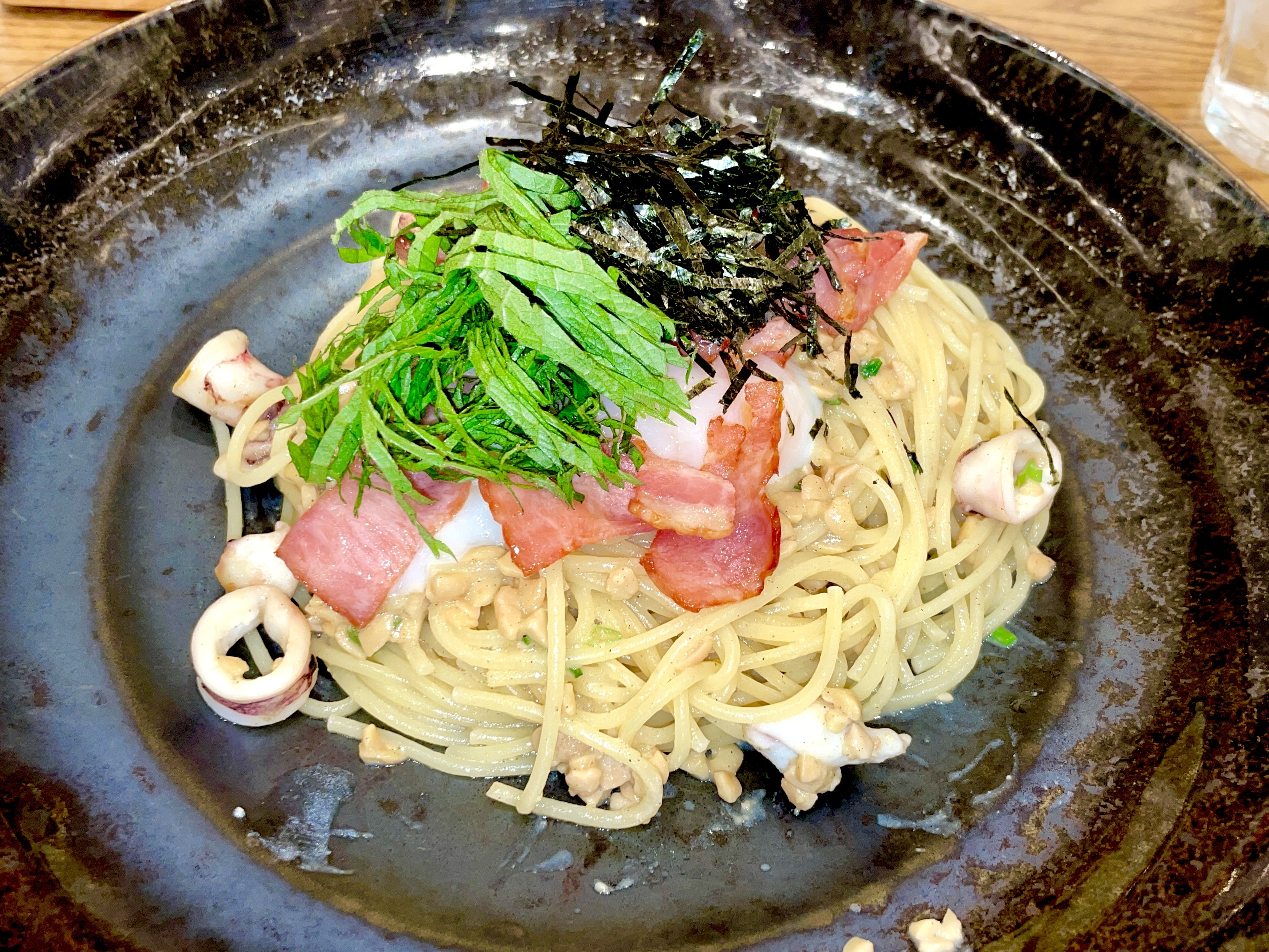 納豆が絡みついたパスタの味わいと
