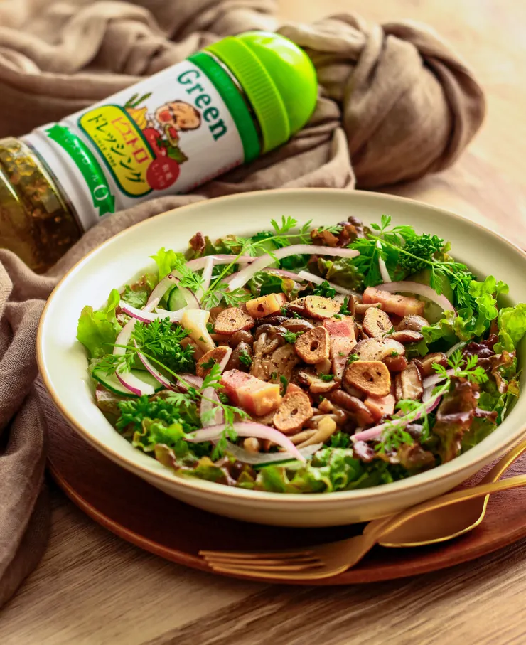 にんにくやきのこベーコンのうまみもありドレッシングとの調和もおいしそうですね。