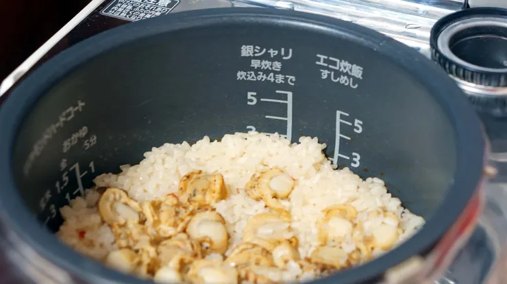 それを見てから何回か作りましたが今回は冷凍のベビーホタテを入れて炊いたら