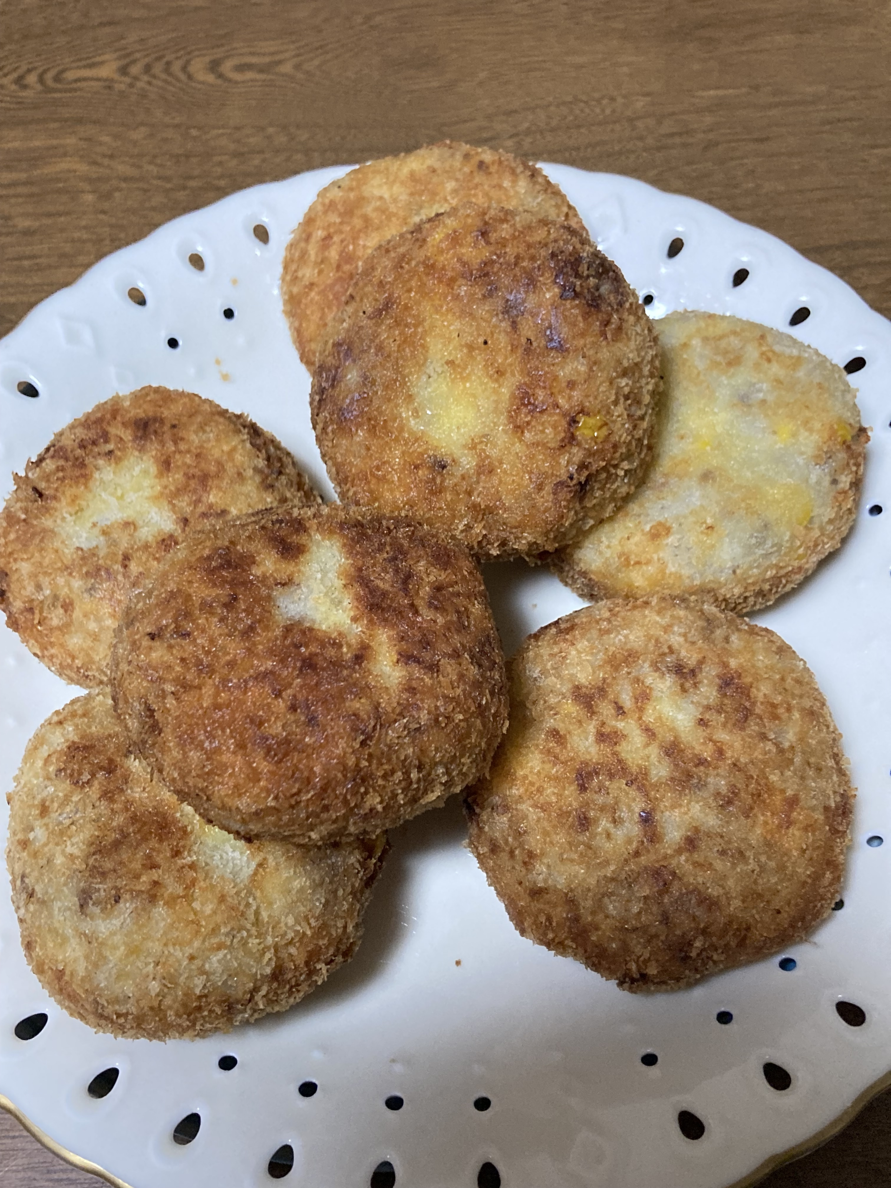 円く平らなコロッケ綺麗な色に上がりましたね、