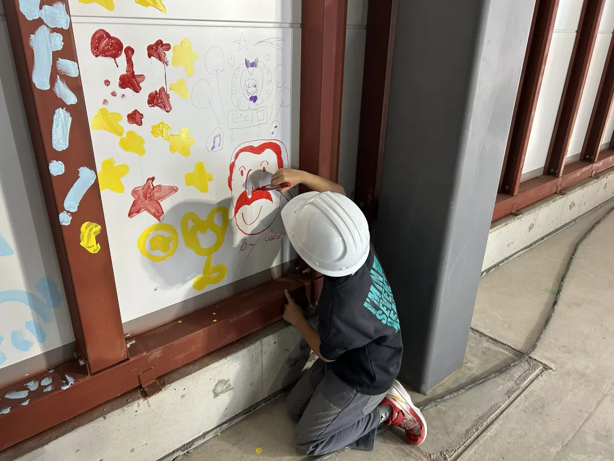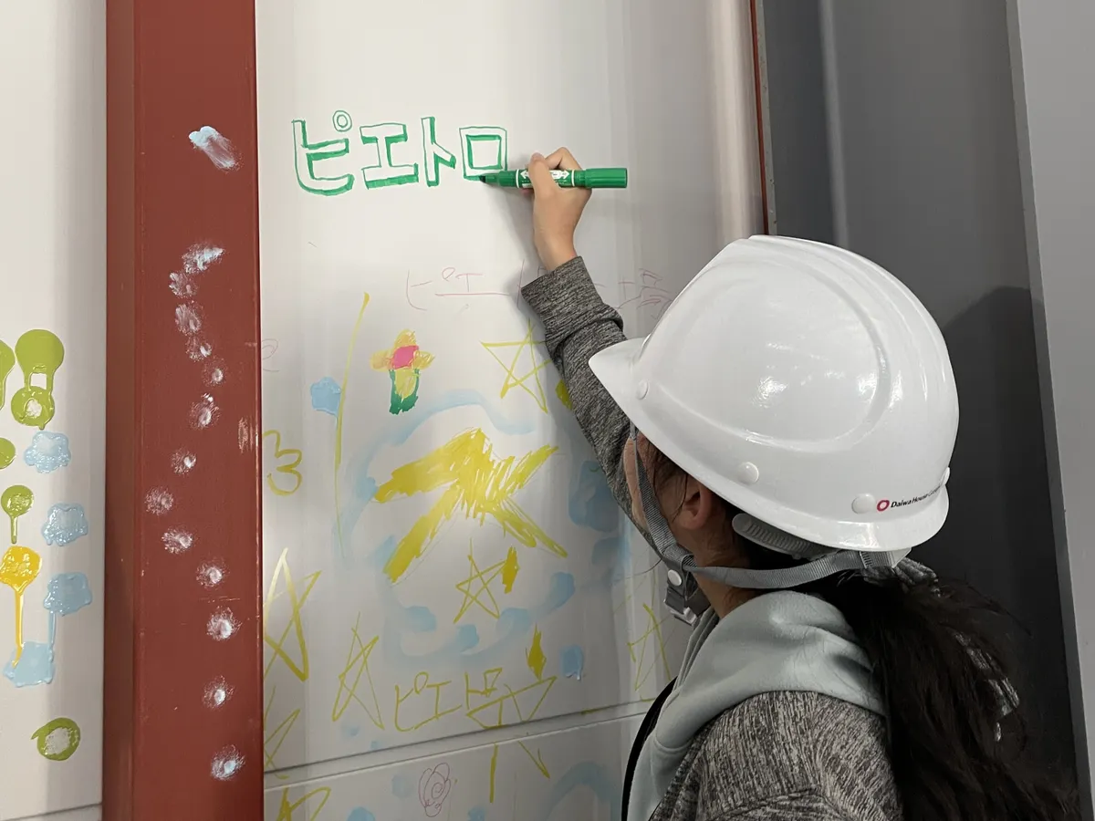 フジタの現場監督さんから「今日の思い出、外壁に何でも描いていいですよ!」とお話がありました。