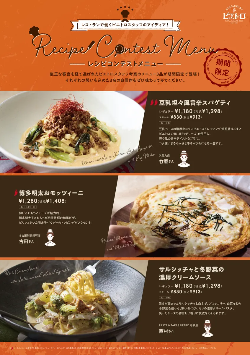 レシピコンテストとは、年に一度、全国のピエトロレストランで働くスタッフが考案したレシピを期間限定でメニュー化する企画です。