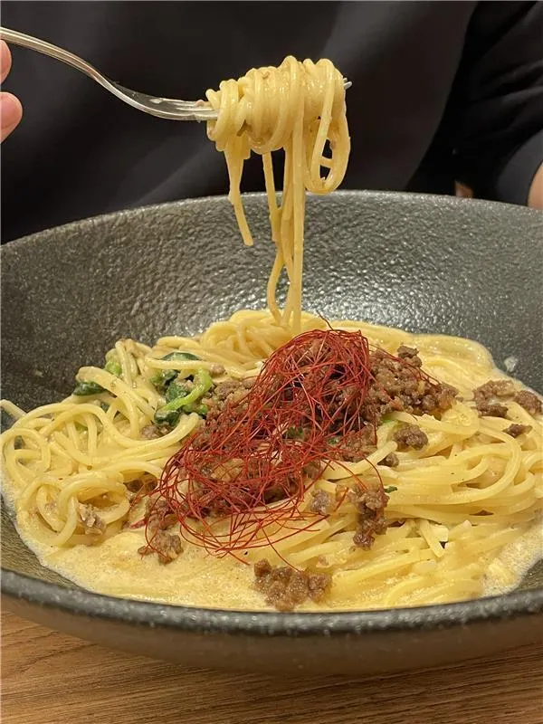 チーズを炙って提供するパスタはめずらしいので、この香ばしい香りも大きな魅力のひとつになっています☺️
