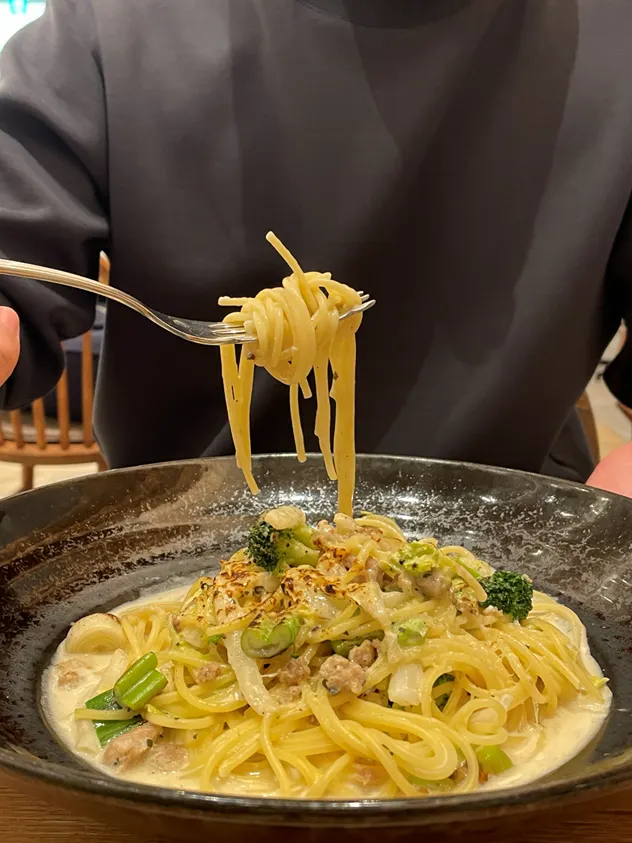 このパスタは旨みが詰まったサルシッチャと白ネギ、ブロッコリー、白菜などの冬野菜を使った濃厚クリームパスタです!
