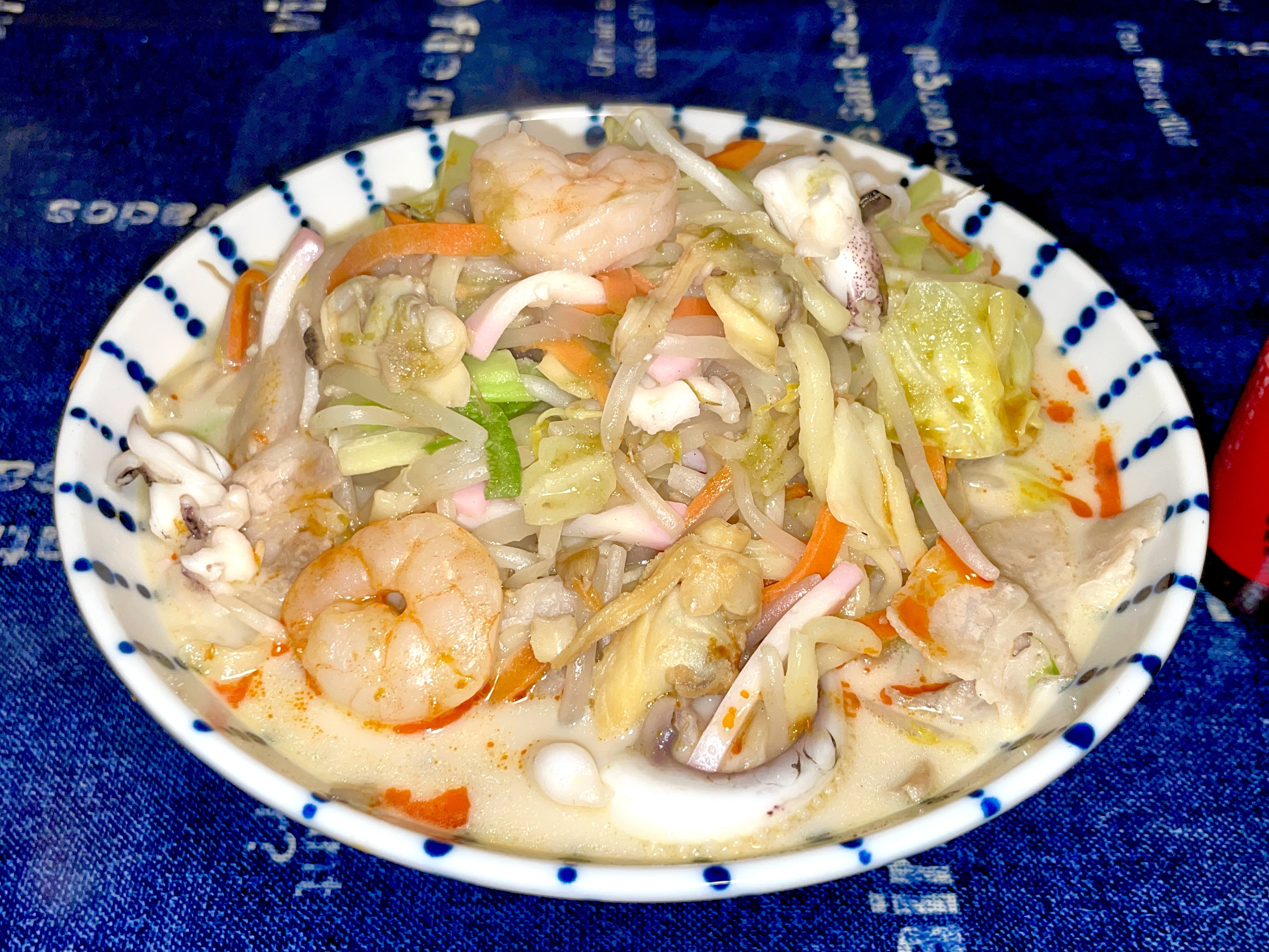 【備忘録用】あきたん作の長崎ちゃんぽん1人前 (具材:豚バラ肉40g[1枚半]、イカ40g、海老50g[3個]、あさり50g、キャベツ80g、人参20g、たまねぎ30g、もやし100g、かまぼこ40g[1/2本]、麺150g[1袋]) / (スープ:鶏がらスープの素、オイスターソース、醤油、すりおろし生姜、牛乳&水[100ml+250ml]、塩コショウ、ピエトロガーリックオイル[炒め油]) / (調味料:CHILLIES! 赤&青…適量【必須】)