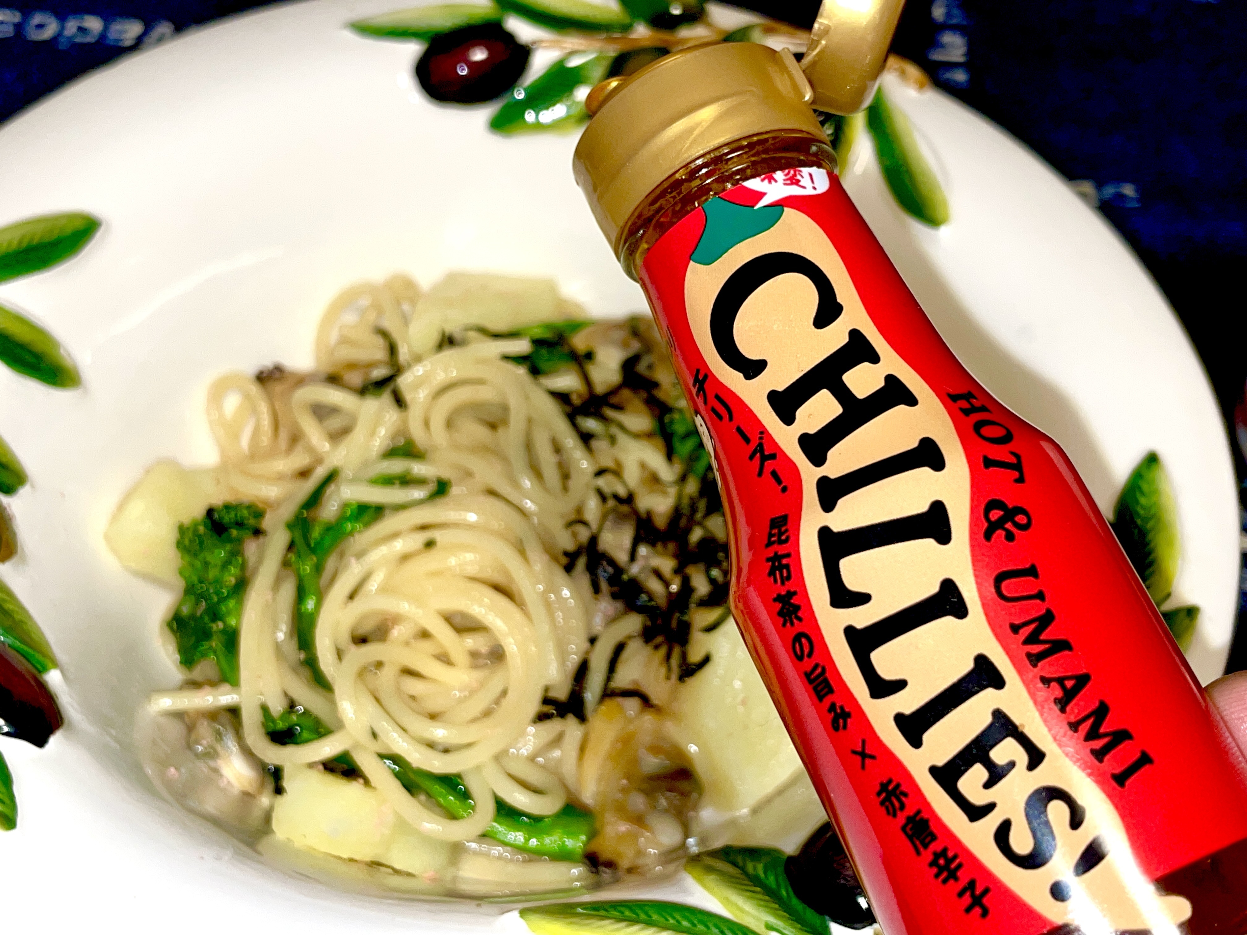 開発担当者から、実は「おうちパスタ たらこ」には青のCHILLIES!も合っておいしいですよ~との情報がありました!