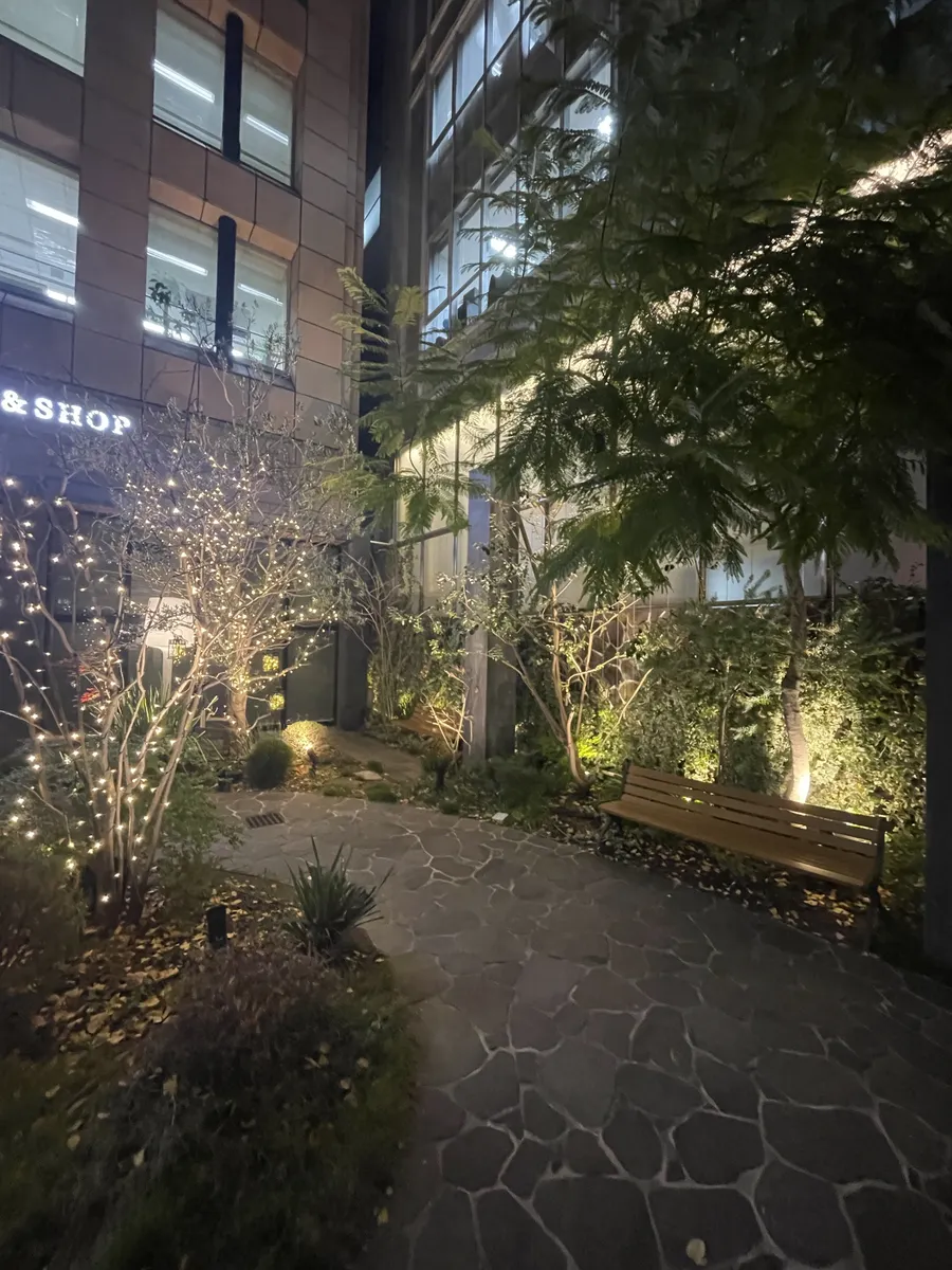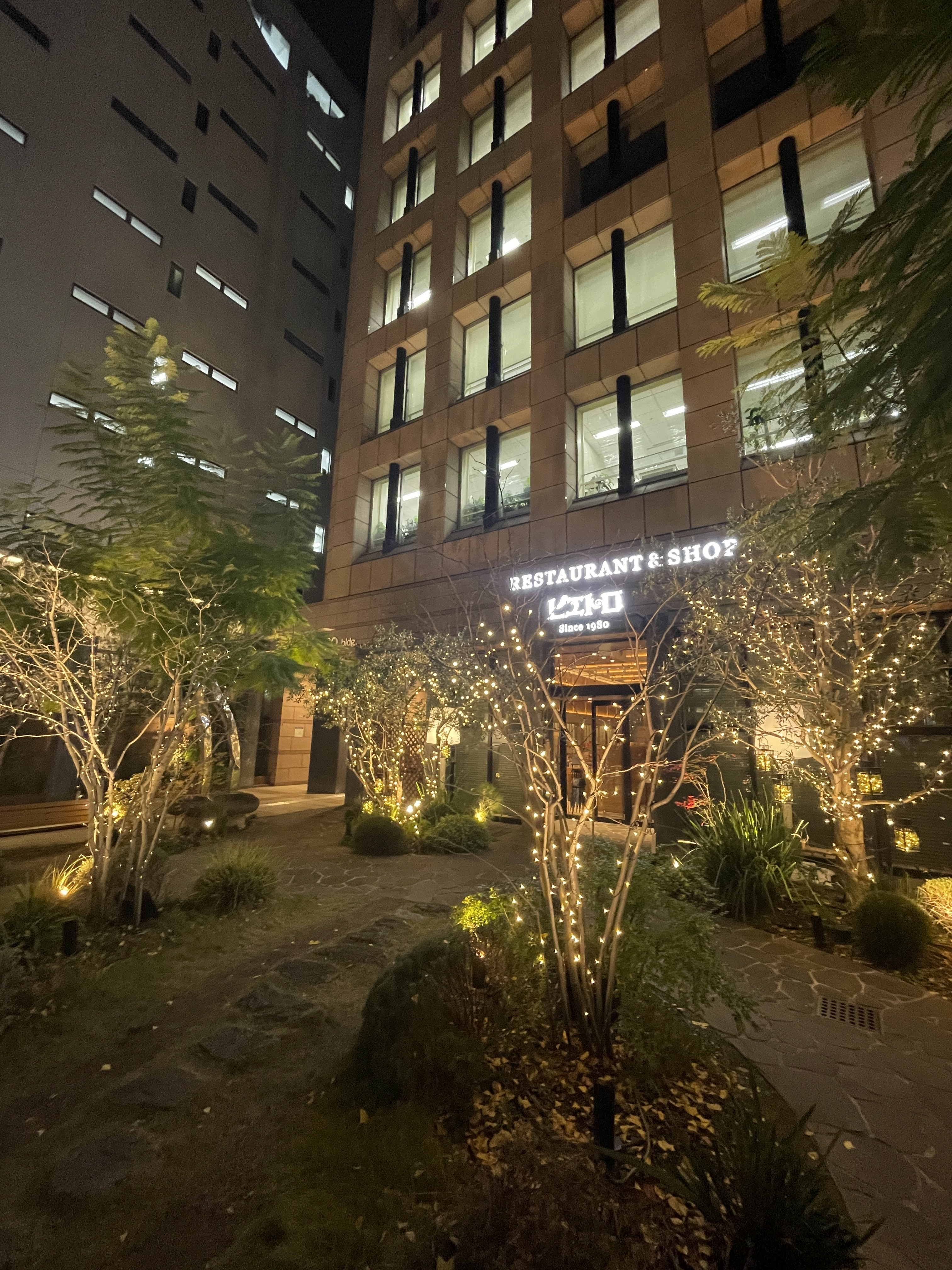 ライトアップされた木々の間を進むと、ピエトロ本店 セントラーレの入口へとつながっています✨️