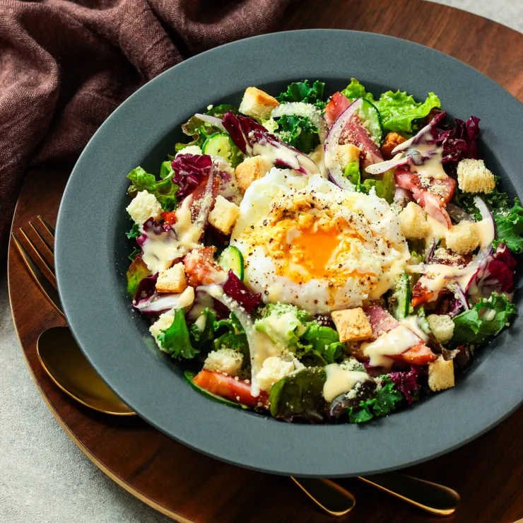 焼いたベーコン、ポーチドエッグ、クルトン、粉チーズを。