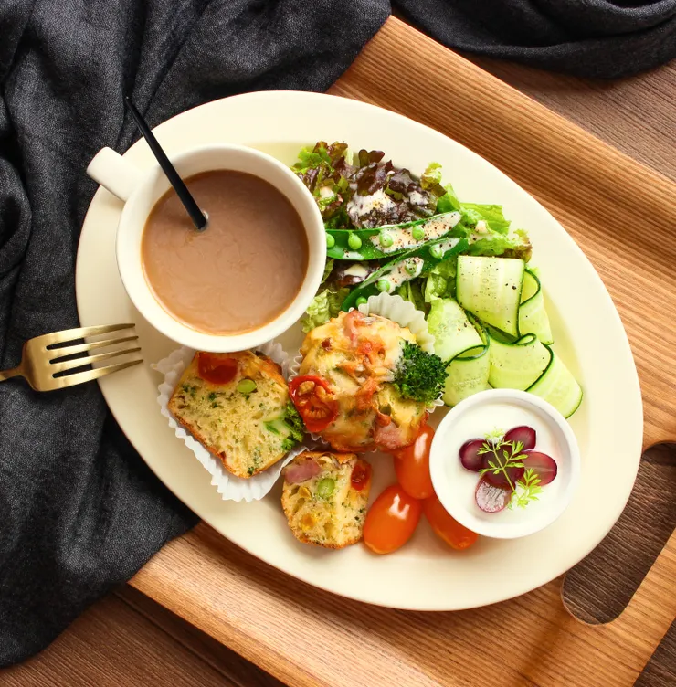 お食事マフィンに、サラダやヨーグルトを添えて、ランチプレートを作りました。