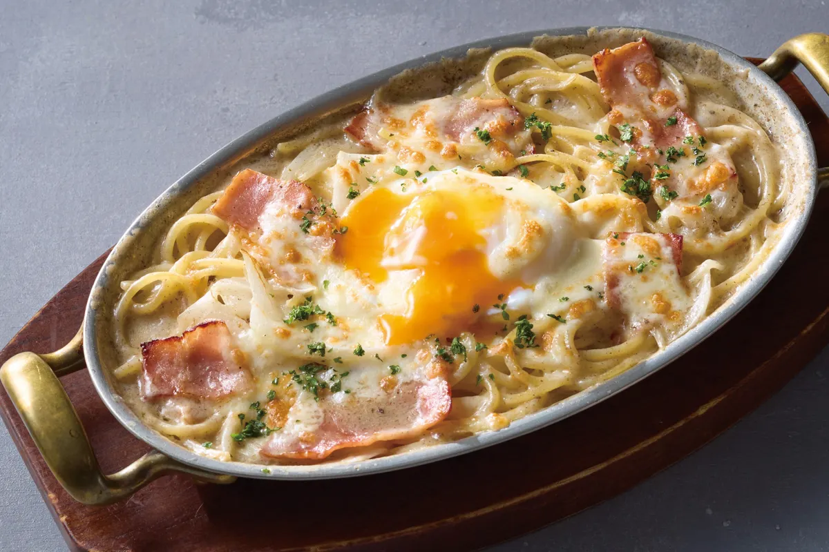 (榮田シェフ)そうですね。これまでのグランドメニューにはクリームソースパスタが少なかったんですが、人気メニューの上位にクリームソース系がはいっていることに気づき、熱々のスパゲティグラタンとクリームソースをかけ合わせました。