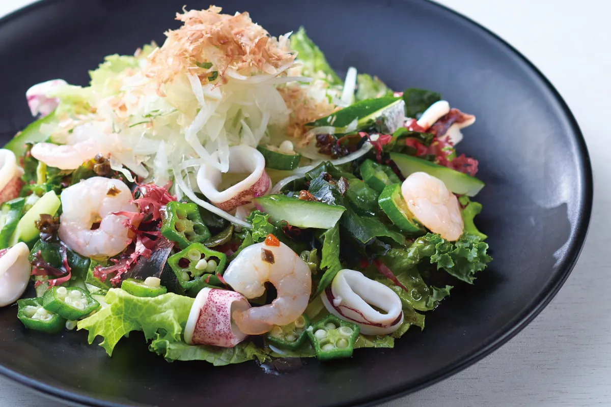 さらに、海藻と相性のいいきゅうりとオクラを組み合わせているので、さまざまな食感をたのしむことができます。シーフードと海藻なので、さっぱりと食べることができるサラダです。