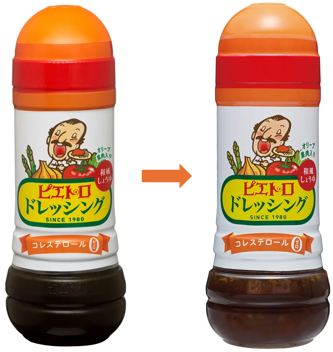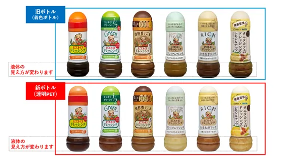 2026年1月製造分より随時、ピエトロドレッシング(280mlシリーズ)のドレッシングのボトルをこれまでの緑色の「着色バイオマスPET」から「透明一般PET」へ変更することになりました。