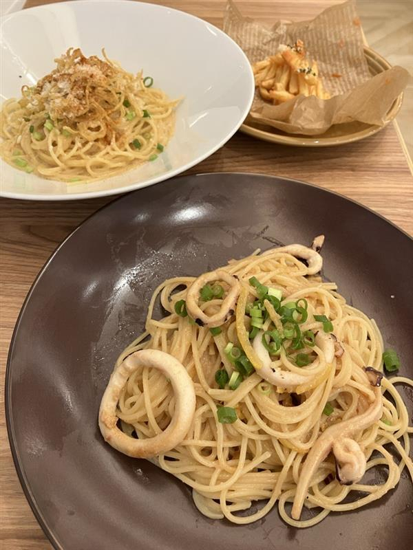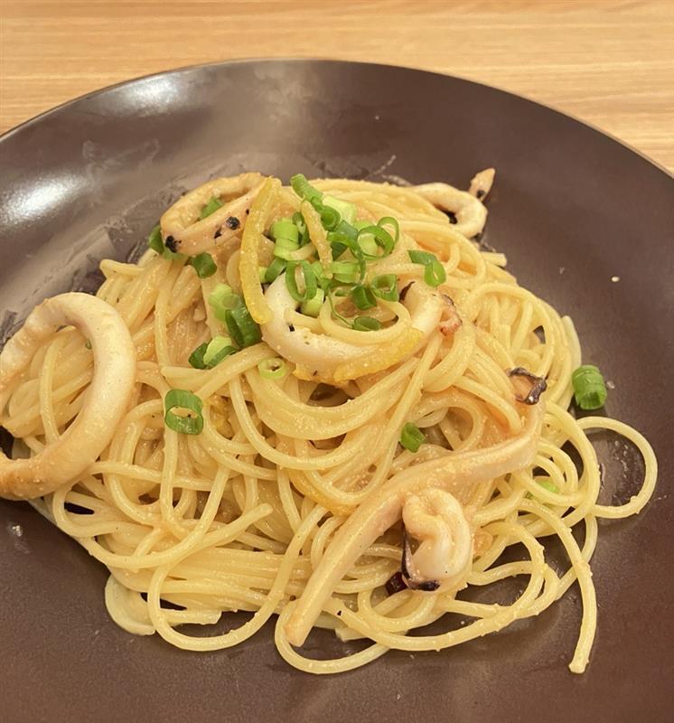 こちらはたらこをあえたスパゲティに、たっぷりの大きなイカ、柚子の皮と小ねぎをトッピングした香りと旨みたっぷりの一品です🦑