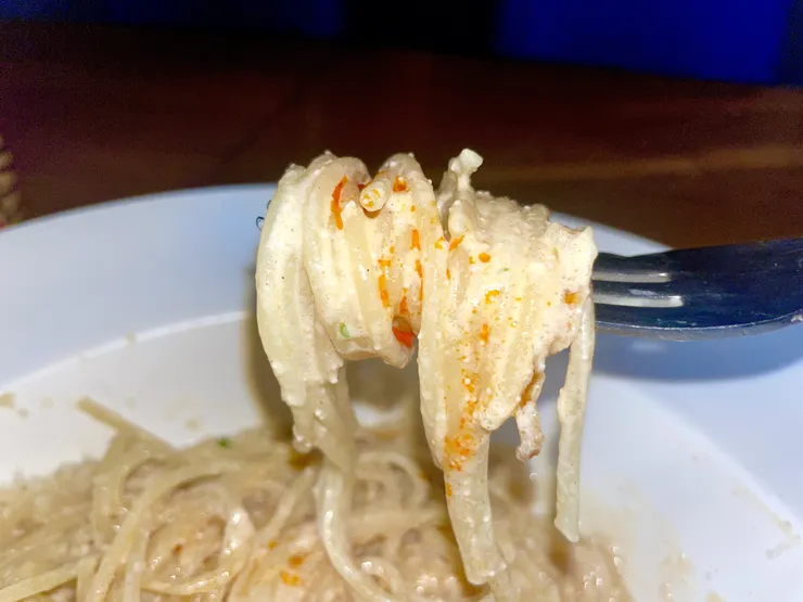 博多明太子カルボナーラにひき肉をトッピングするのもおすすめですよ🤭