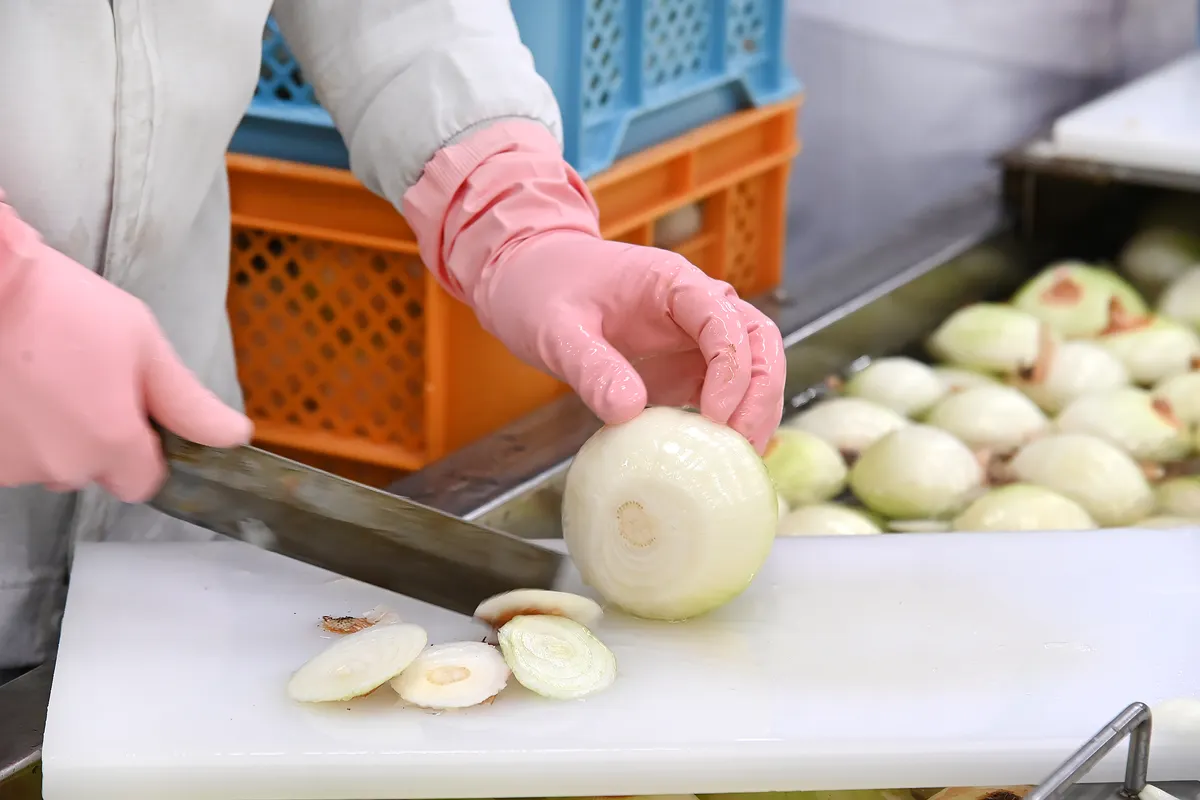 なかなかイメージしにくい量ですが、すべてのたまねぎを人の手で皮をむき、必ずひとつひとつ人の手でカットして、芽が出たものや傷みがないかを人の目でチェックしています。