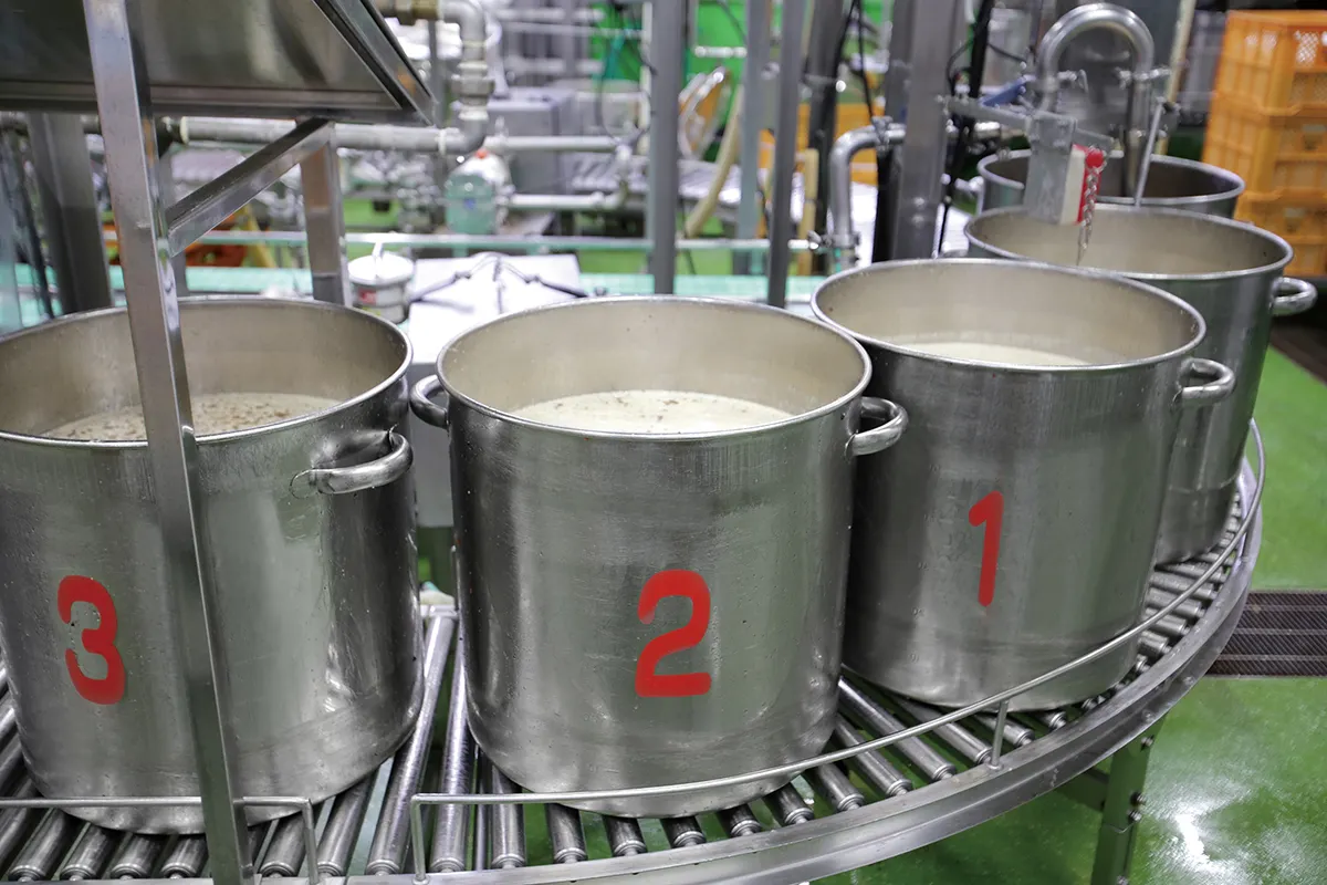 ピエトロの工場では1日約5万本のドレッシングが作られます。しかし、作るのは大型タンクではなく、1つあたり約180本しか作れない、レストランの厨房でよく使われている「寸胴鍋(ずんどうなべ)」🍲。一度に大量に作ると味がぶれてしまうため、少しずつを繰り返して作っています。