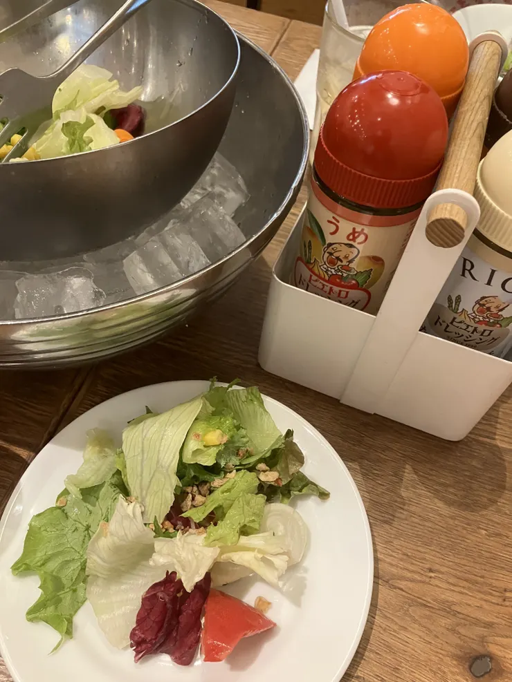 よく冷えたシャキシャキのサラダ🥗に色んなドレッシングとパットフッテ🧡美味しすぎる🥰久しぶりのピエトロドレッシングは幸せの味でした。