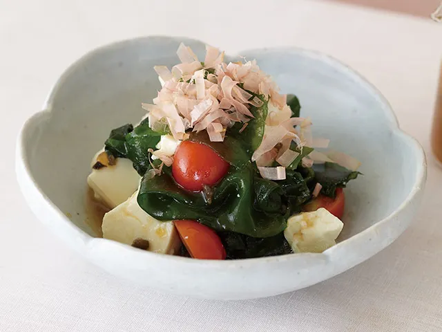 わかめ・トマト・豆腐を組み合わせた、見た目も鮮やかなさっぱりとしているサラダです。
