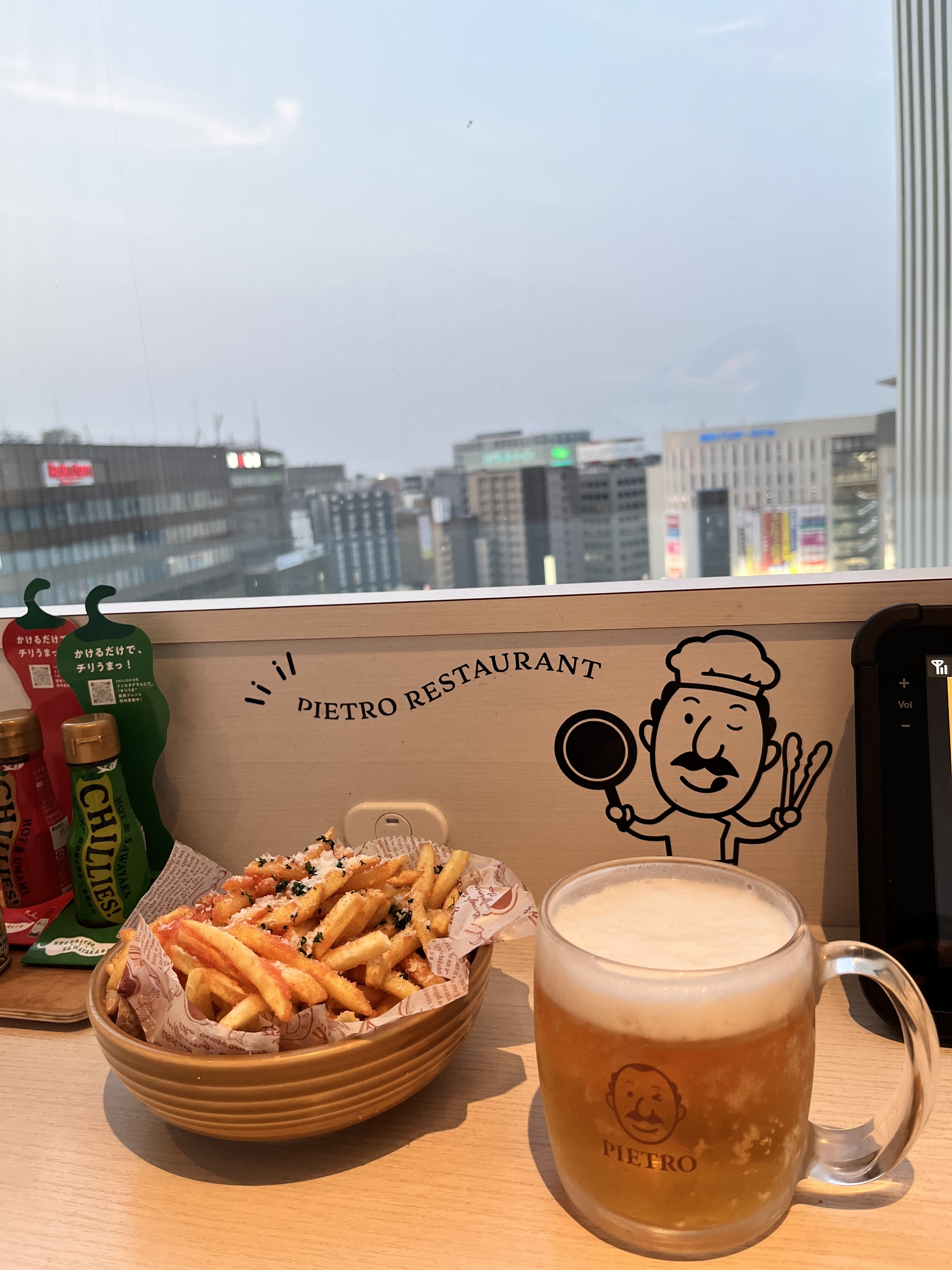 外の風景を眺めながらポテトにビール🍻