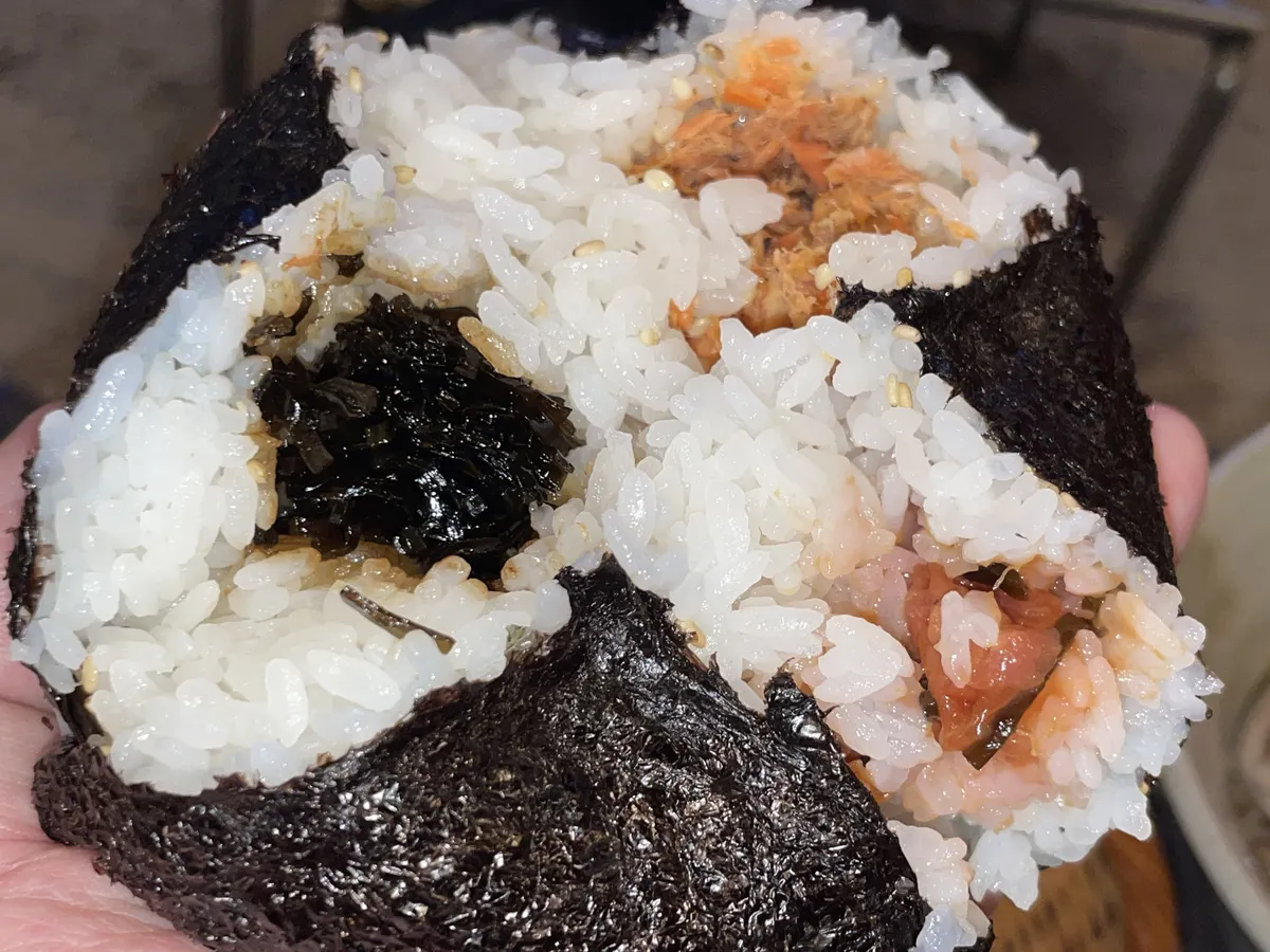 鮭・昆布・梅の入った大きなおむすびに