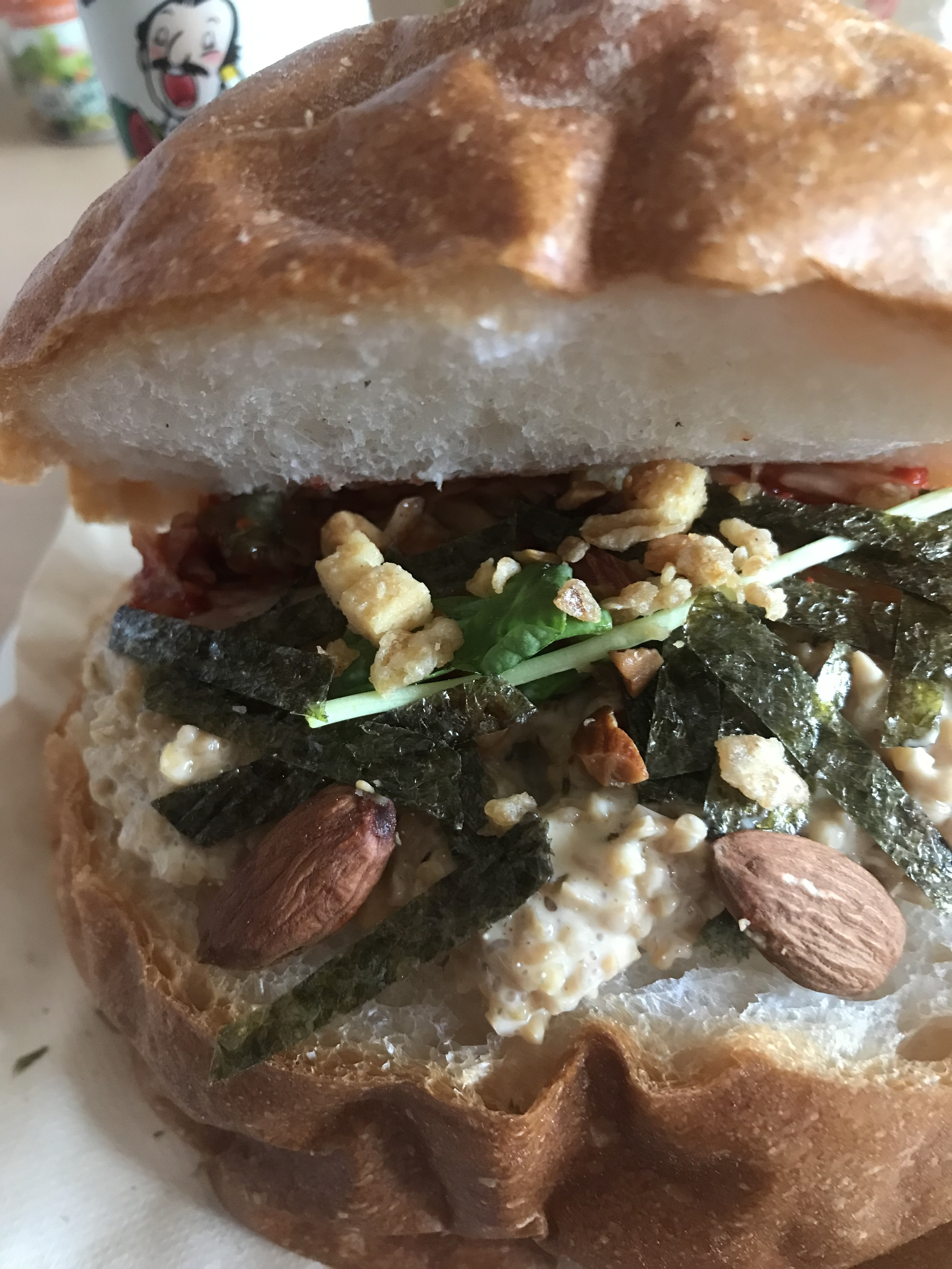 納豆、マスタード、キムチ焼き海苔をはさんで食べました