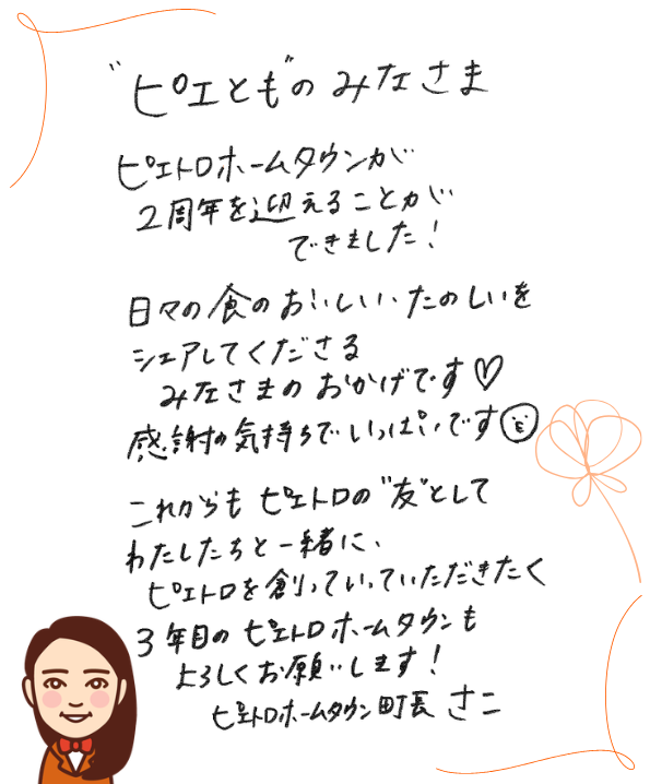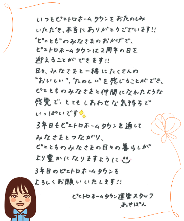 いつもピエトロホームタウンをおたのしみいただいているみなさまへ、ピエトロホームタウン運営スタッフからのメッセージです✉️