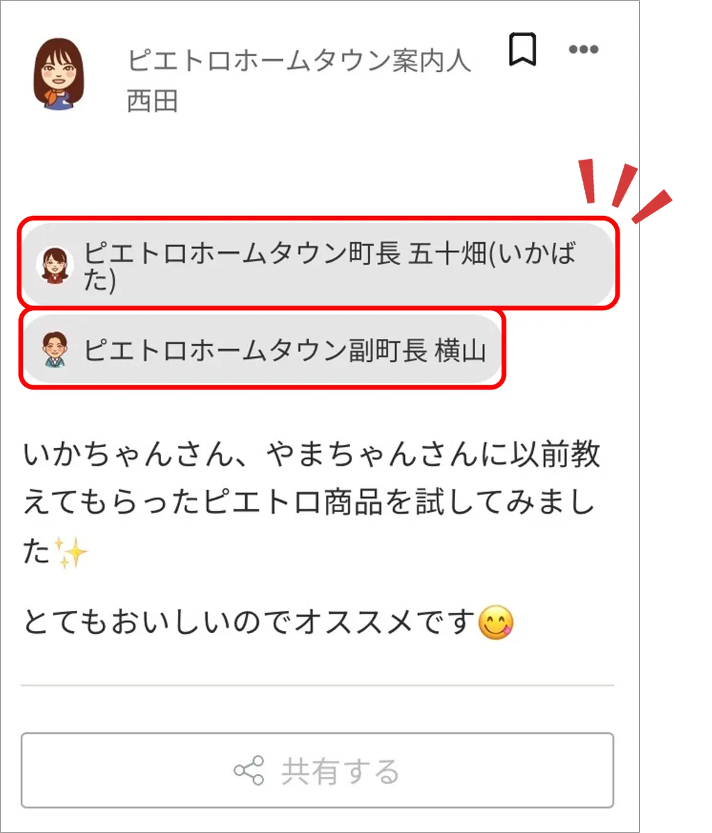 メンション機能を使って、さらにピエトロホームタウンの仲間たちとの交流をたのしみましょう♪