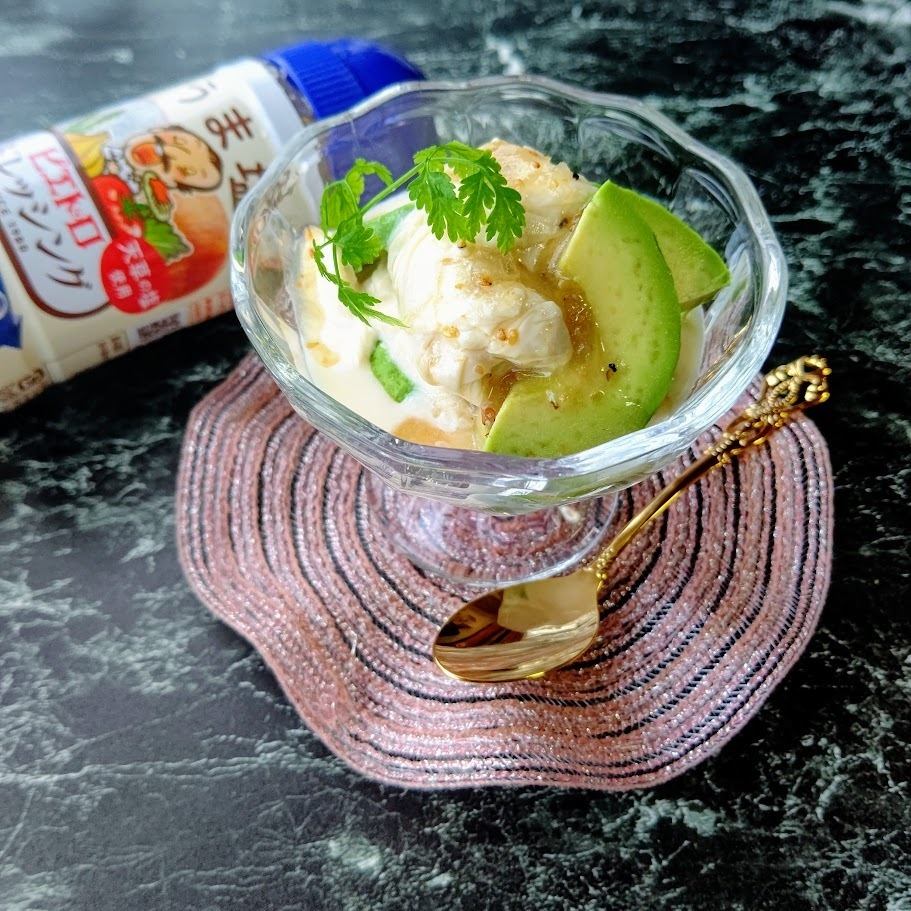 クリーミーでとろけるような生ゆばにコクのあるアボカド。そこにうま塩ドレッシングをかけて。