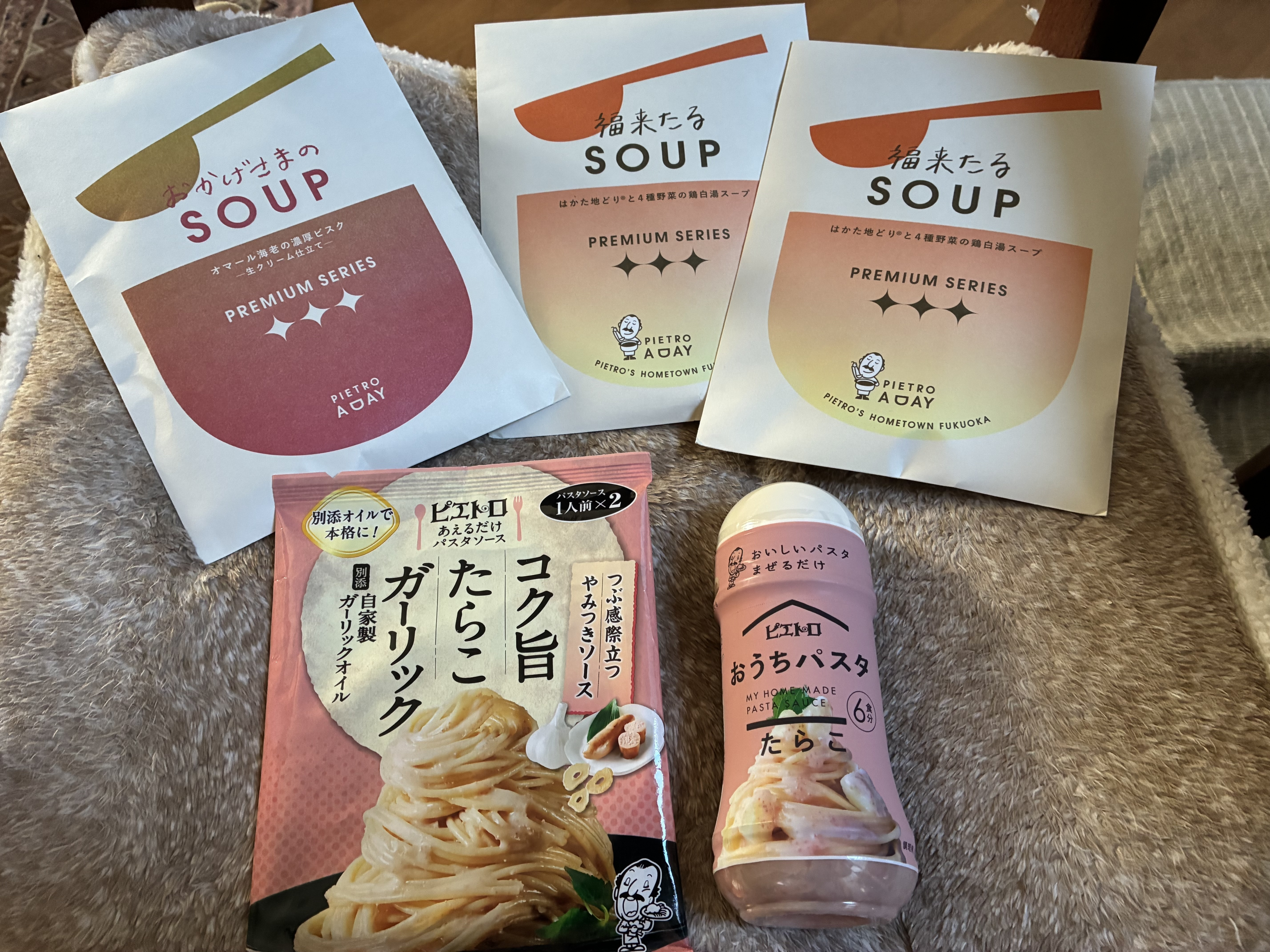 自宅用には新商品の「おうちパスタ たらこ」「あえるだけパスタソース コク旨たらこガーリック」と前から気になっていた「PIETRO A DAY はかた地どりと4種野菜の鶏白湯スープ」を買いました!