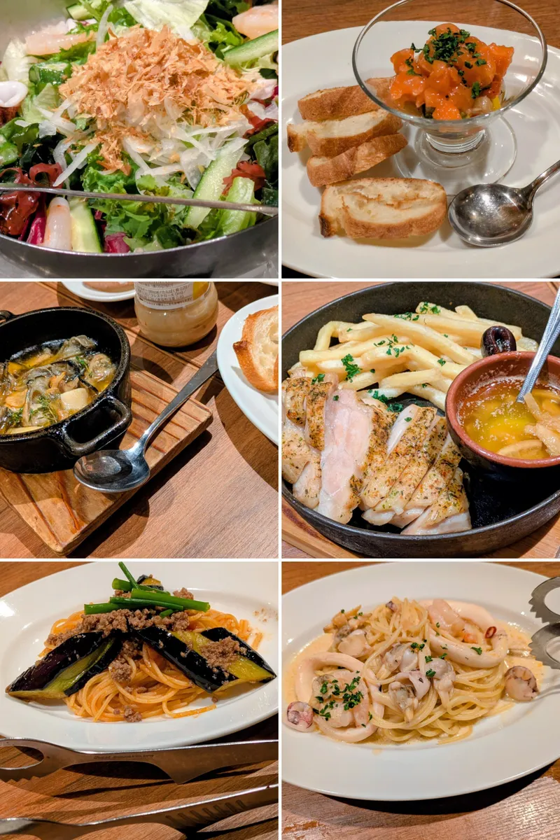 アヒージョやサーモンと野菜のタルタル普段食べられないお店ならではの味を楽しく取り分けメインやデザートまで全てが綺麗で美味しかったです