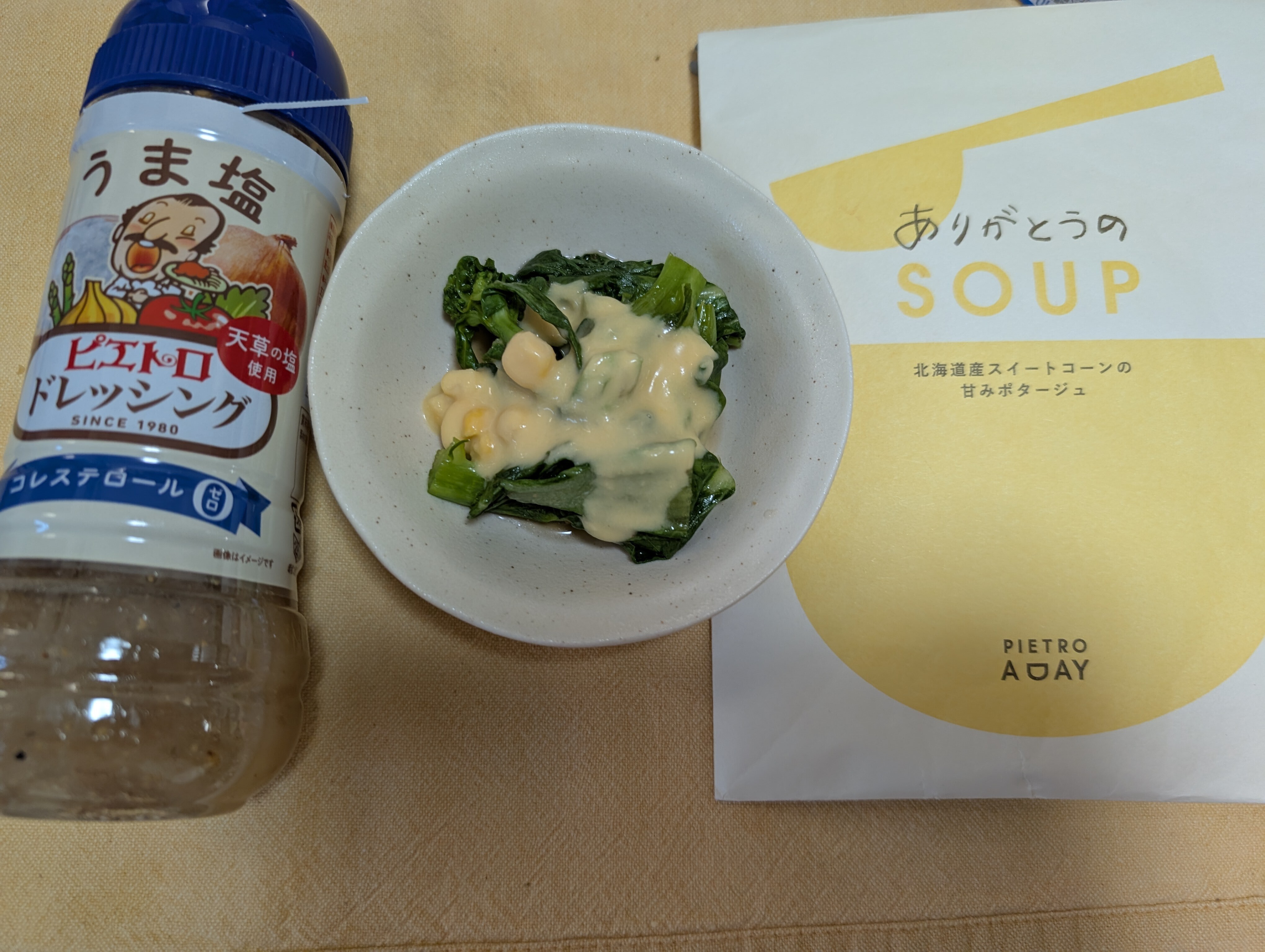 そして、残りはお浸しにしておろしポン酢と少し砂糖、うま塩ドレッシングで味付しそこにピエトロのコーンスープ🌽をソースにかけてみました✨✨✨