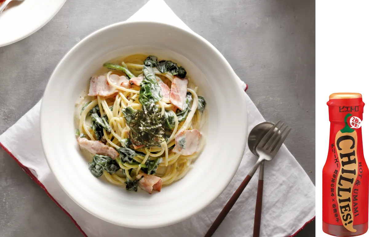 町長おすすめは「ベーコンとほうれんそうのクリームソース」に赤いチリーズをかけること。