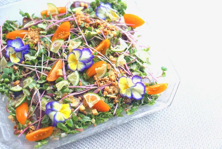 タマネギを器に盛りつけその上に鰹を盛り香味野菜、ミニトマトをのせてさくらかいわれを散らしてスダチのイチョウ切りを散らしパットフッテフライドオニオン&ガーリックを振る