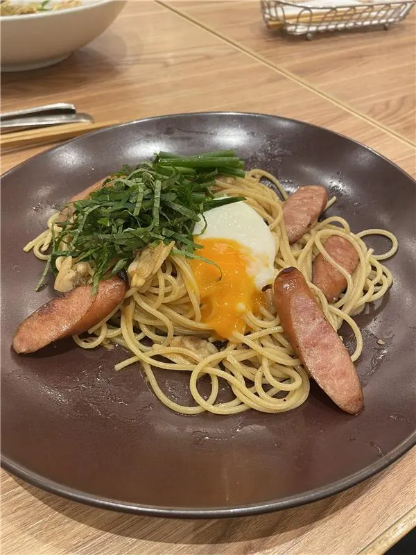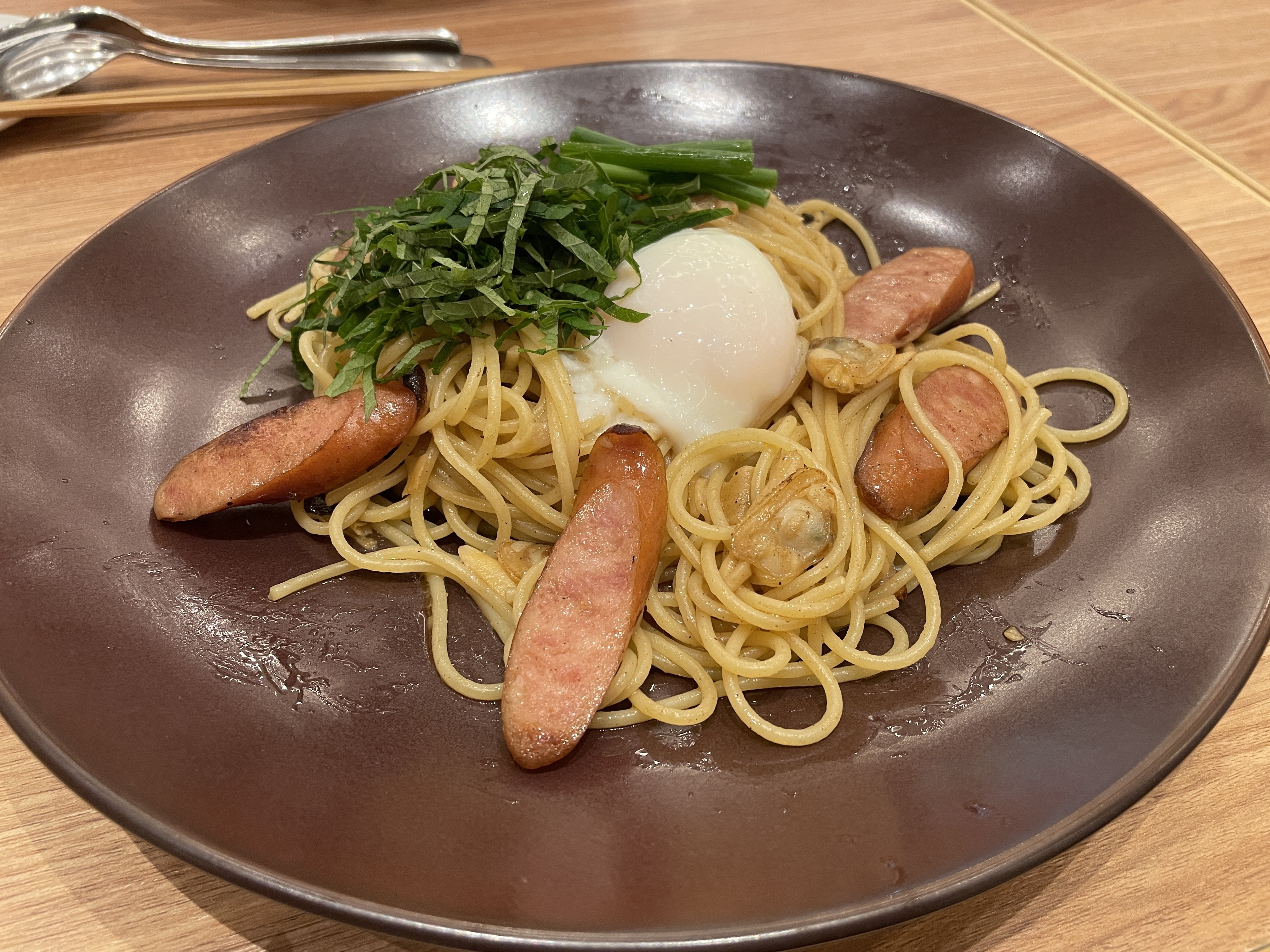 「ソーセージと青じそのペペロンチーノ あさりと半熟卵トッピング」!