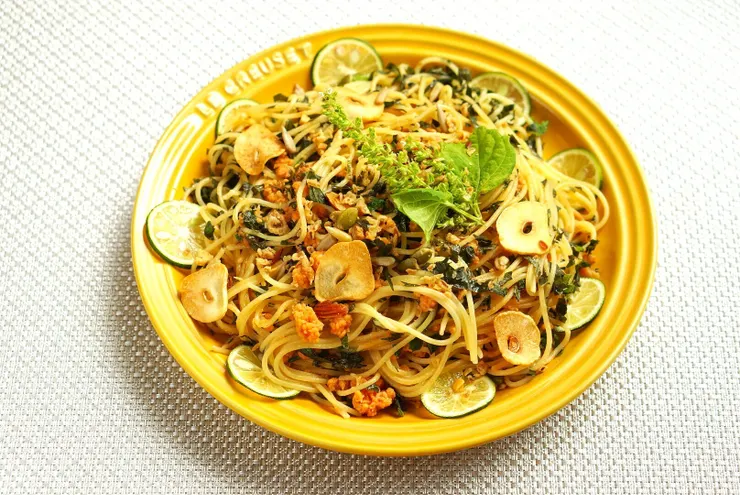 ゆで上がったスパゲティーと鮭フレークを入れて混ぜてから青ジソを入れて軽く混ぜたら火を止めてよく混ぜる