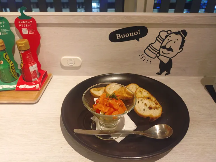 前回来たときから気になっていた『サーモンと彩り野菜のタルタル』。ワンランクアップの食事の気分。メニューの写真に惹かれて決めた『海の幸のガーリッククリームソース』