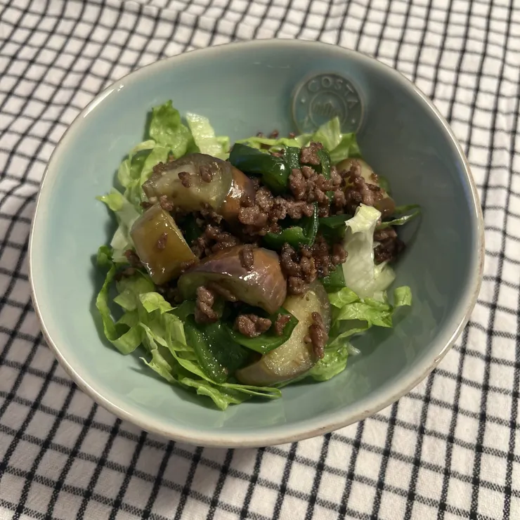収穫したなす🍆は、ピーマン、牛ひき肉と一緒に