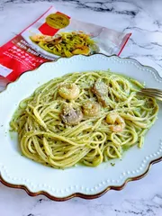 海老とマッシュルームのバジルクリーム お昼に食べました。バジルの香り良くソースもたっぷり。ただ具材がちょっと寂しかったかな😅(盛り付けたお皿の関係もありますが…)