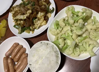 大皿にドーン╰(*´︶`*)╯♡ 大皿にドーン!ホルモンの味噌炒め、カリフラワーとソーセージの湯掻いた物╰(*´︶`*)╯♡皆さんで盛り付けてくださいスタイル🍚御飯が美味しい季節ですね✨