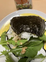 😋焼き塩鯖🍙 【40日目】塩鯖を焼き、身をほぐしておにぎりの具とする。のりでまき半分に切り、野菜とパットフッテをかける。美味しい😋