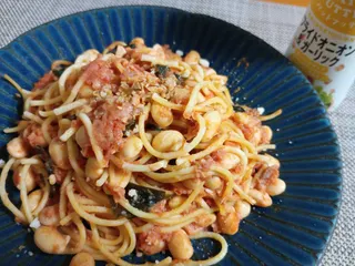 55日目!ツナトマトのパスタにパットフッテ! 大豆をたっぷり入れたパスタを作りました!パットフッテをかけていただきました😊