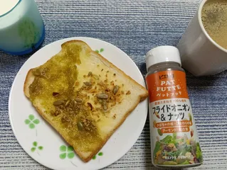 ずんだジャムと 【52 日目】トーストを半分バター、もう半分にずんだジャムを塗り、パットフッテ。美味しくいただけました!