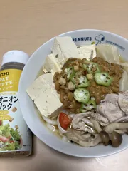 水餃子🍲に 【31日目】水餃子、うどん、豆腐、しめじ、豚肉を納豆にパットフッテをかけて